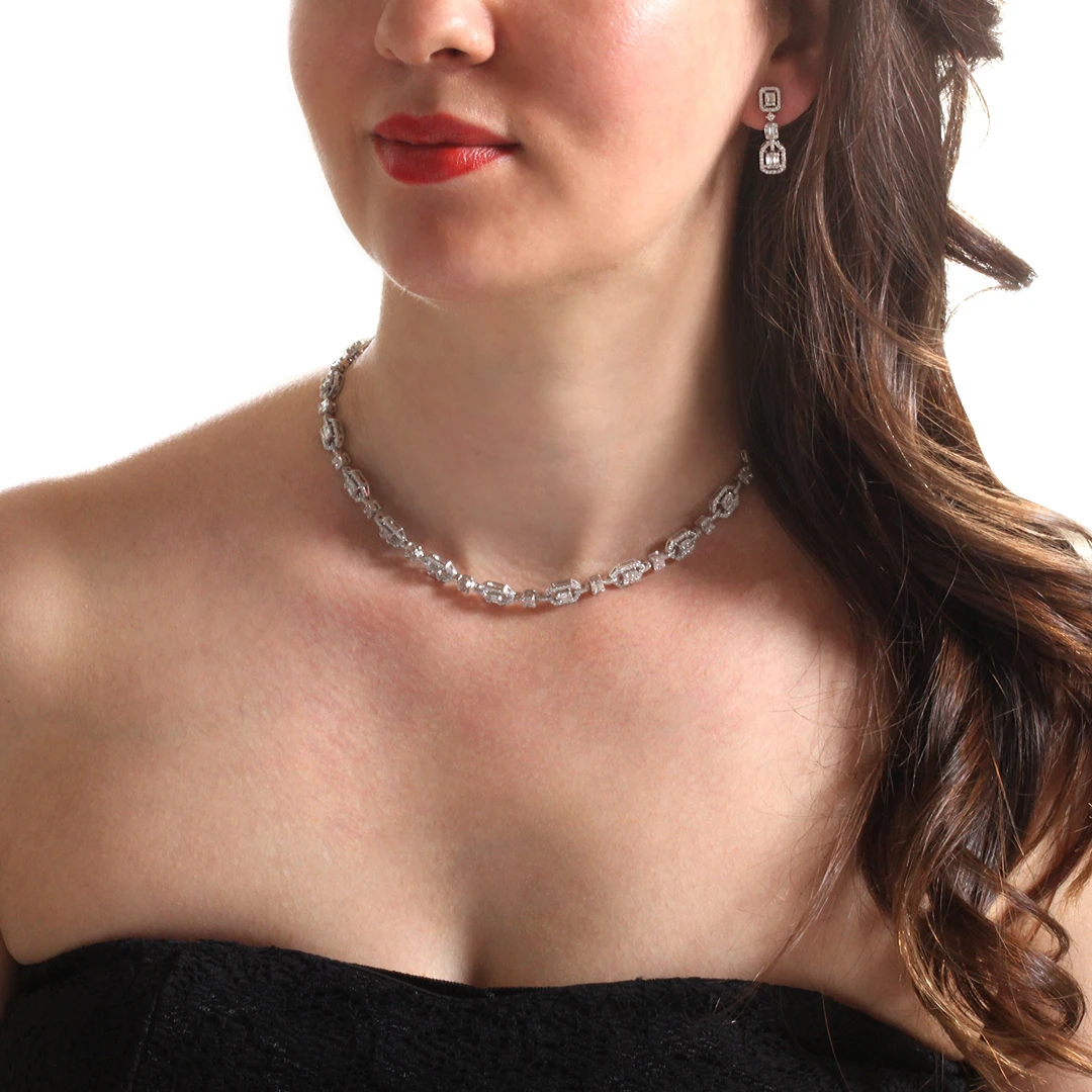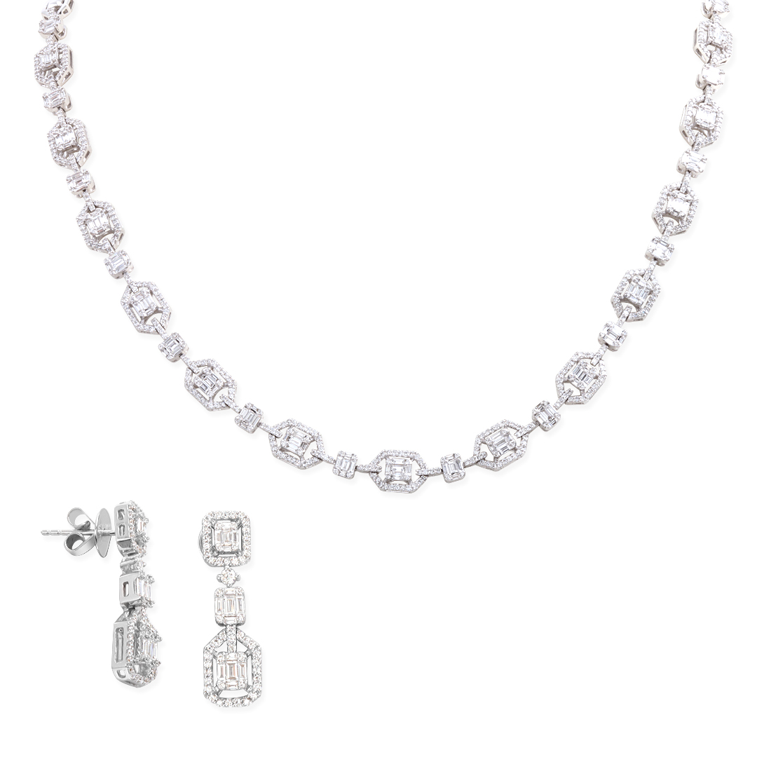 18 Ayar altın baget model 47,10 gram ağırlığında F/VS kalite 6,05 ct baget ve yuvarlak pırlantalı küpe ve gerdanlıktan oluşan zarif ve modern tasarımlı takı seti. Özel günlerinizde bir gün değil size bir ömür eşlik etsin..