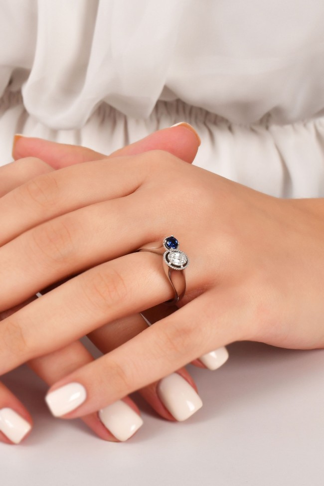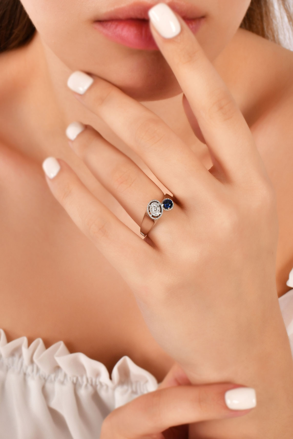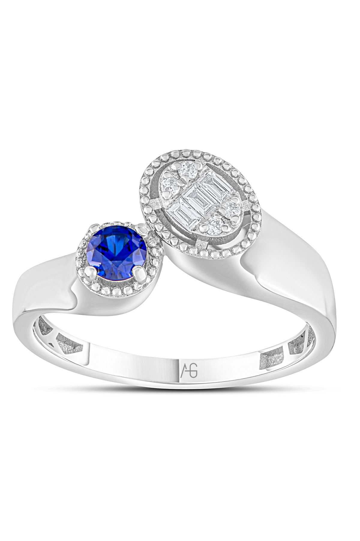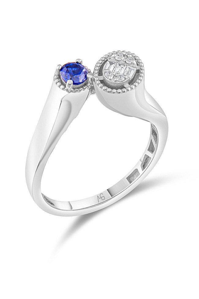 Safir ve 0.08 Ct. F/SI taş detaylarına sahip 14 ayar beyaz altın tasarım model pırlanta yüzük.