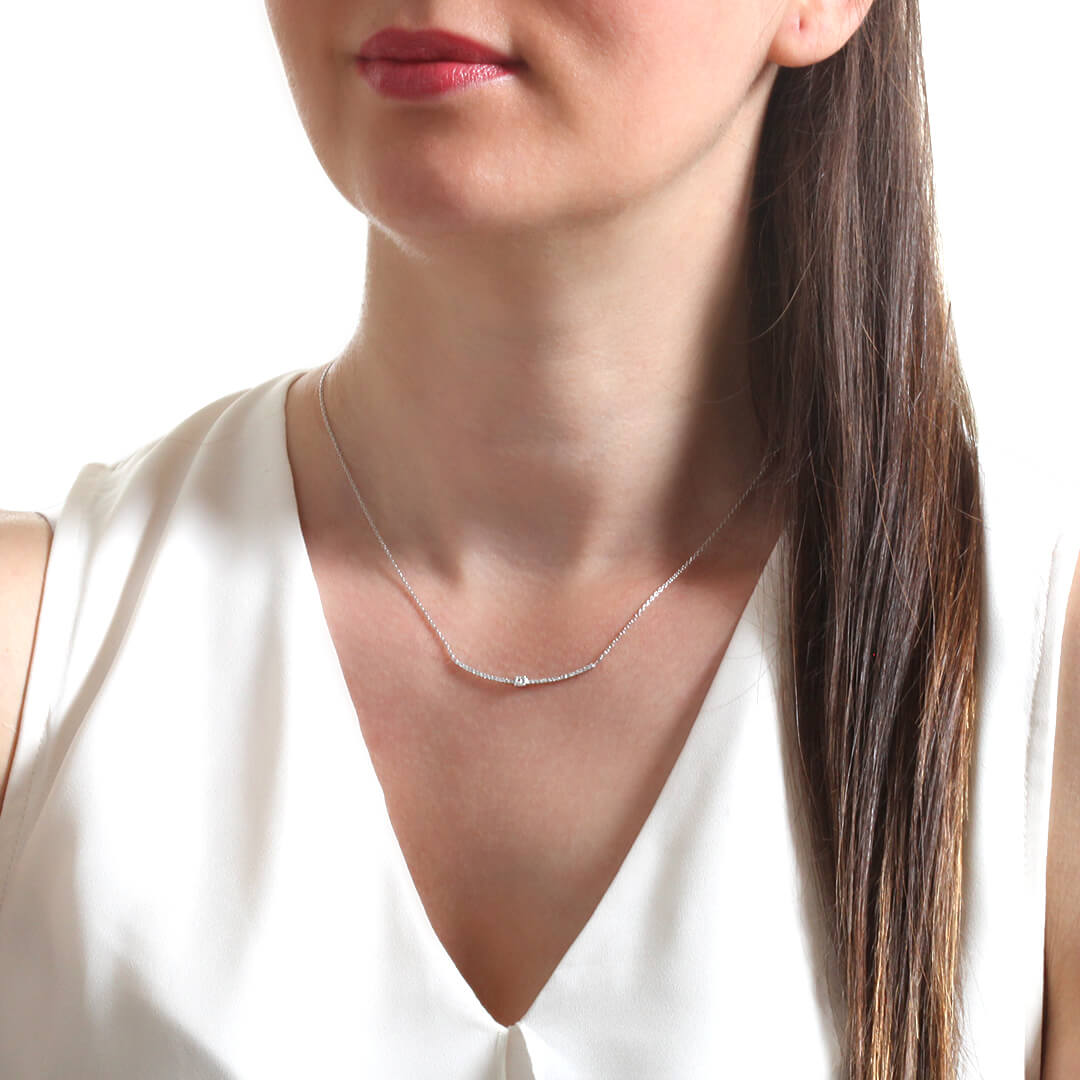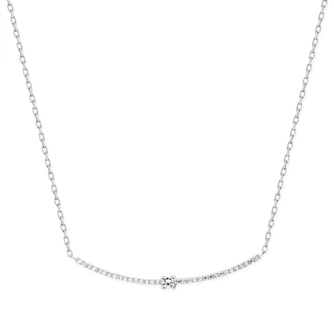 Özel günlerinizin vazgeçilmez hediyesi olan minimal ve modern tasarımlı 0,20 karat pırlantalı 2.35 gr 14 ayar beyaz altın kolye.