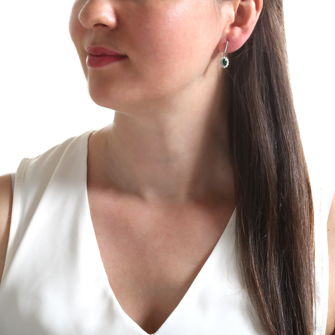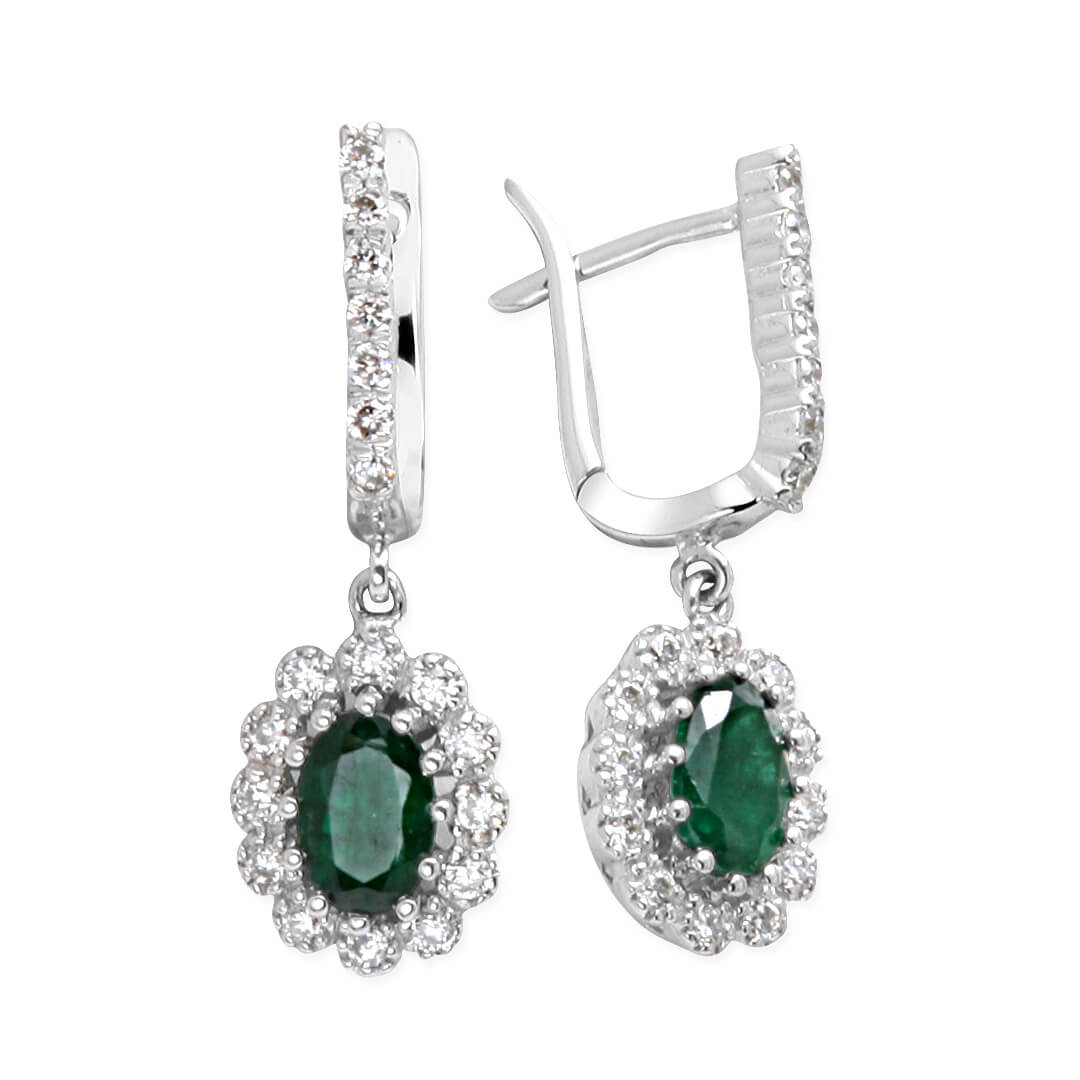 0.36 karat yuvarlak H-VS kesim pırlantalarla ve 1.46 Ct. oval kesim zümrütle taşlanmış el emeği, özel işçilik kalitesiyle tasarlanmış hafif sallantılı oldukça şık ve hoş bir modele sahip pırlanta 18 ayar beyaz altın zümrüt anturaj küpe.