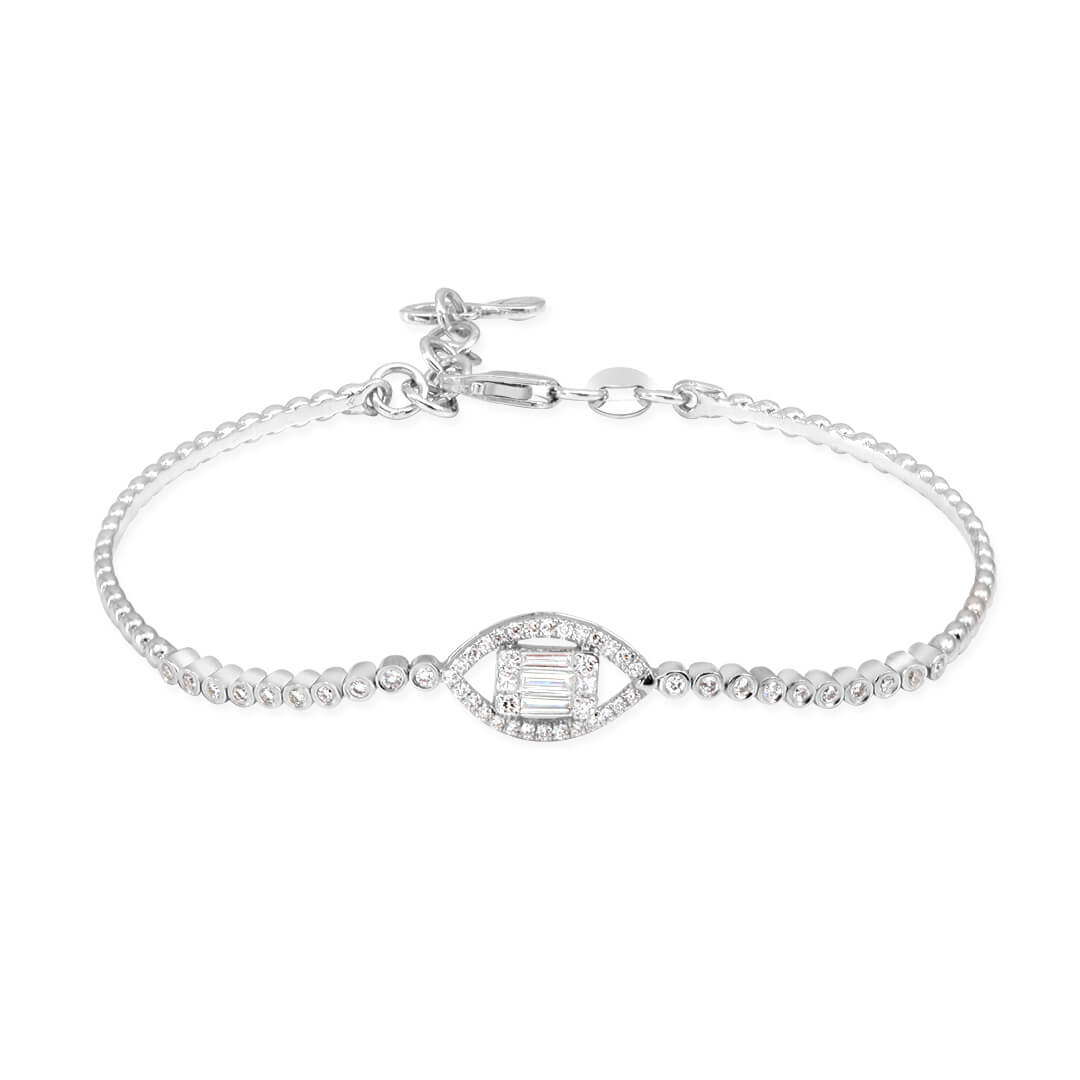 Sade ve zarif 14 ayar beyaz altın 0.39 ct. G/SI pırlanta baget taş detayı ile ışıltısına minimal detaylarla dokunuşlar yapılmış günlük olarak da kullanabileceğiniz ışıl ışıl modern tasarım bileklik.