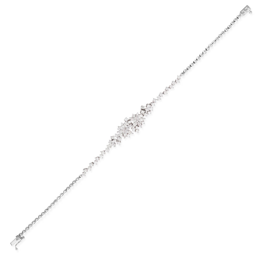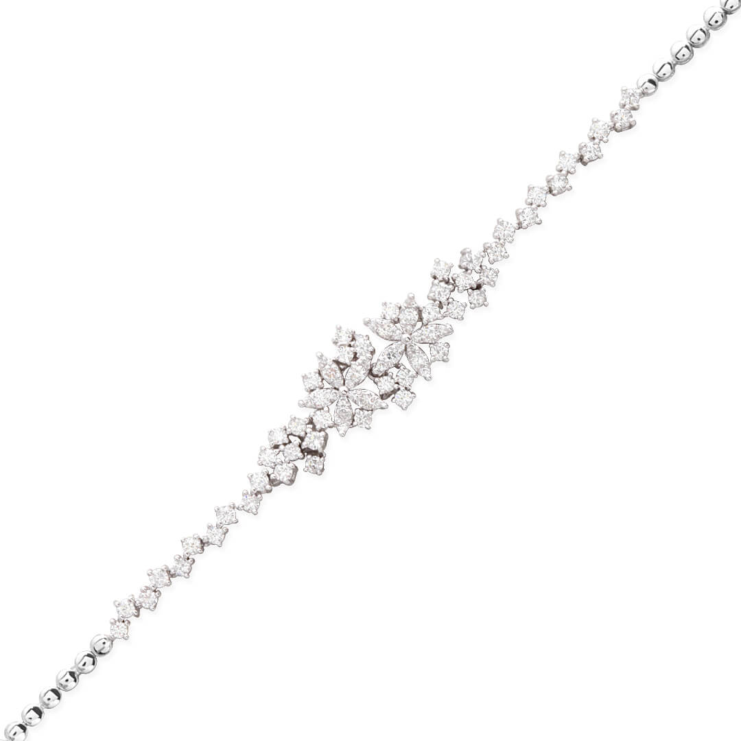 Sade ve zarif 14 ayar beyaz altın 1.24 ct. F/SI pırlanta yuvarlak, markiz ve damla taş kombinasyonu ile ışıltısına çiçek detaylarla muhteşem bir hava katılmış her zaman severek kullanabileceğiniz ışıl ışıl modern tasarım bileklik.