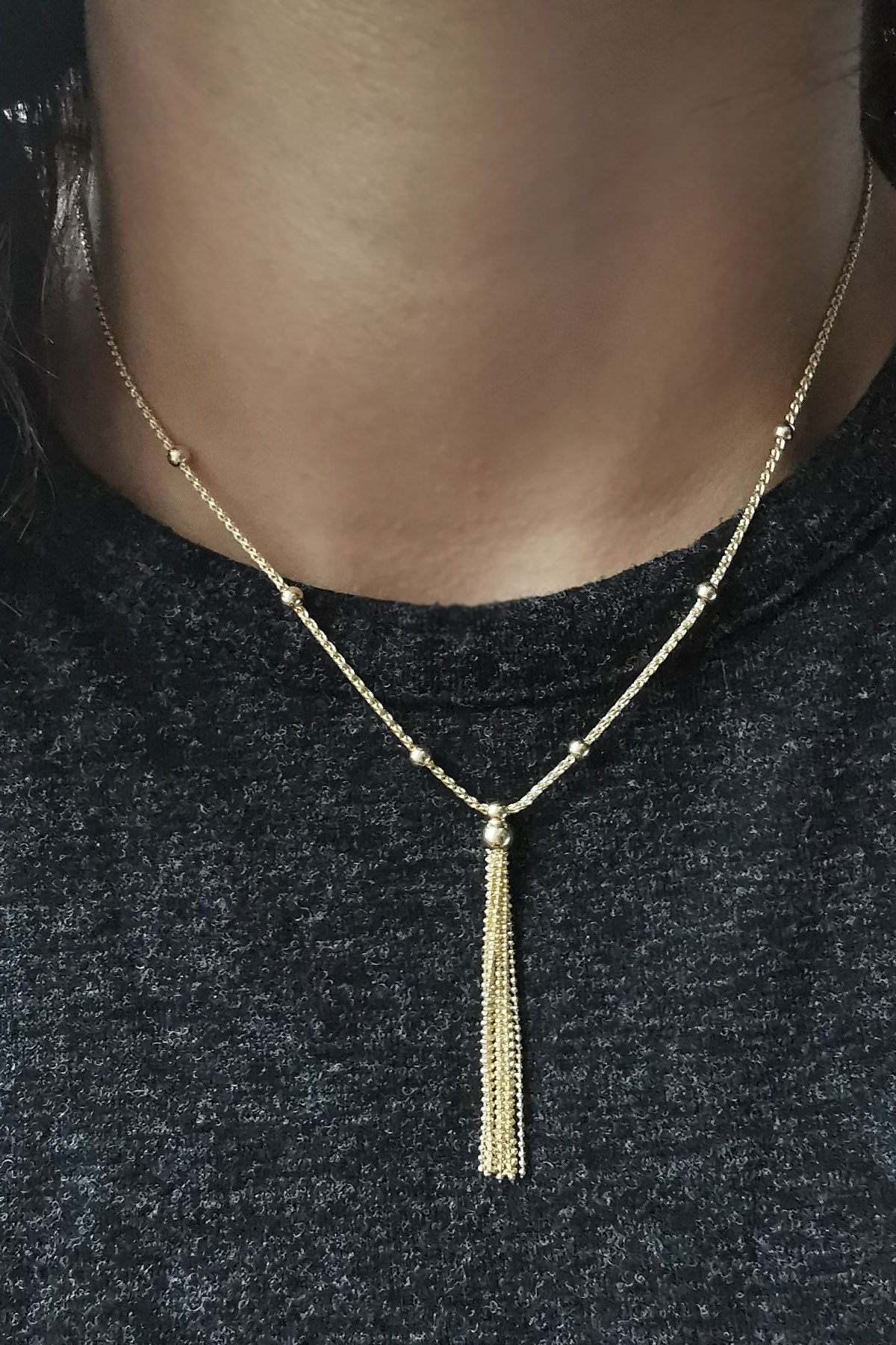 6.70 Gram ağırlığında püsküllü tasarımı ile boynunuzdan ayırmayacağınız tüm giyim kombinlerinize harika bir bütünlük ile eşlik edecek 45 cm 14 ayar altın zincir kolye.