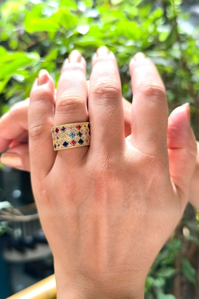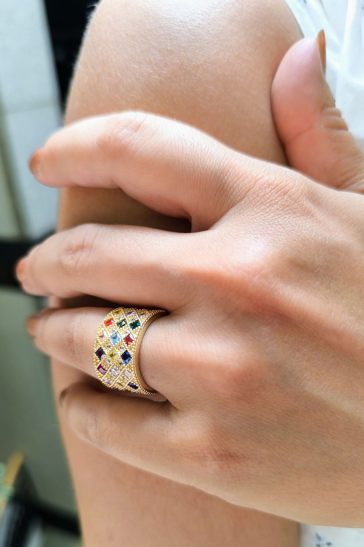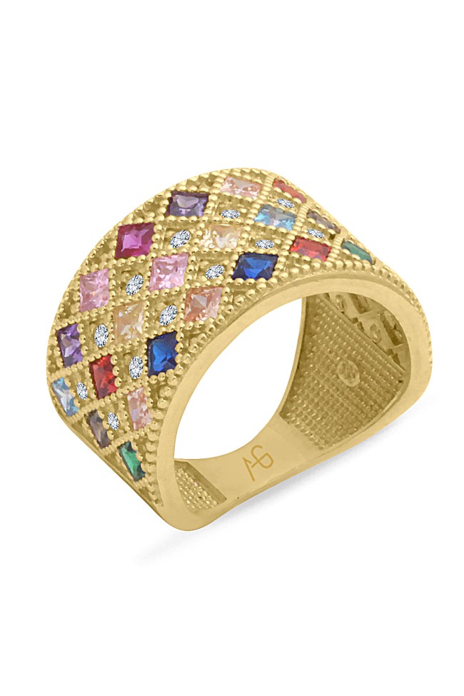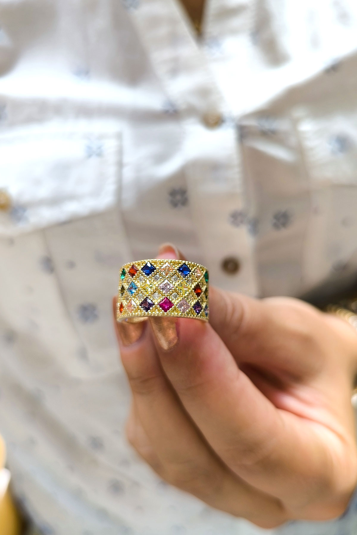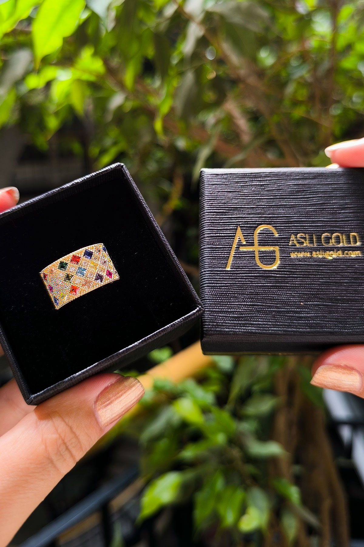 14 Ayar şık ve modern tasarım günlük kullanıma uygun renkli zirkon safir taşlı ışıl ışıl özel geniş gösterişli tasarımıyla havalı bir model 8.40 gram ağırlığında altın kadın yüzük.