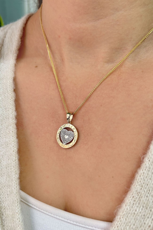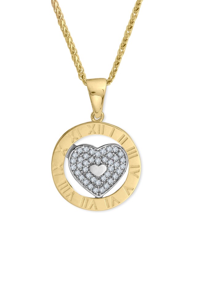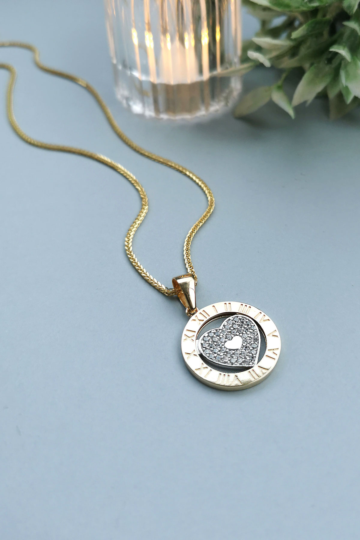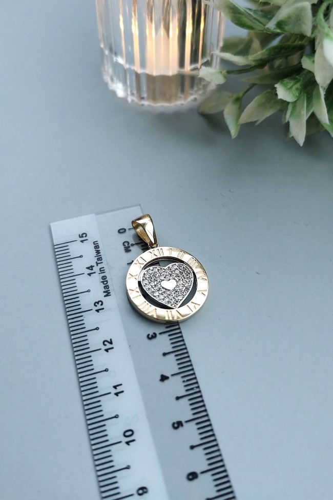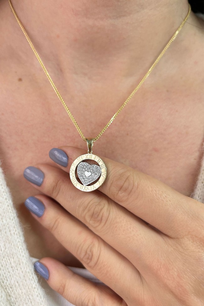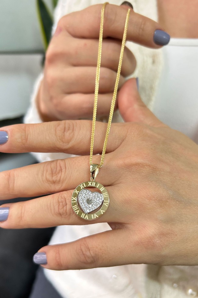 14 Ayar orta kalp kısmı hareketli, döner tasarım şık, spor ve günlük kullanıma uygun 45 cm spiga zincirli altın zirkon taşlı Roma rakalmlı kolye.