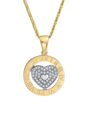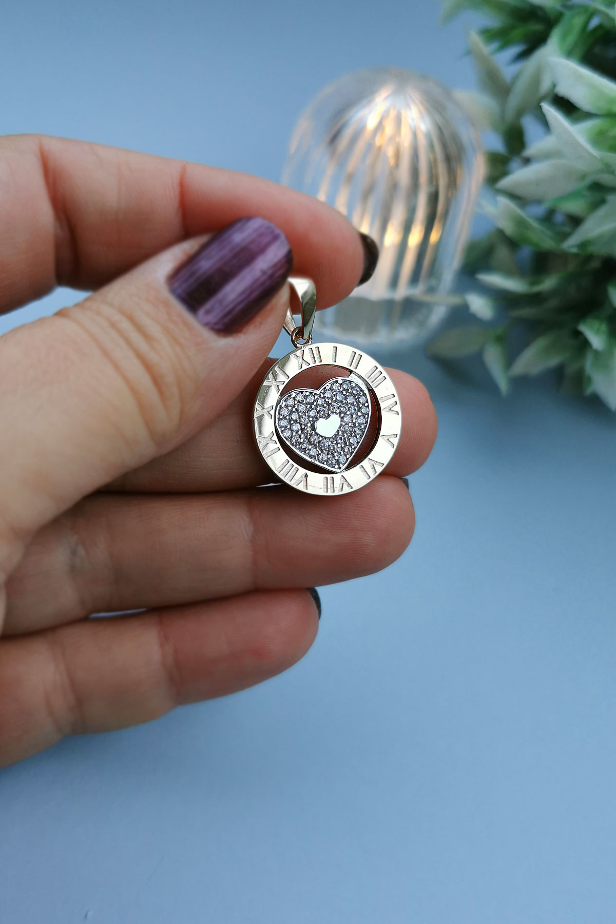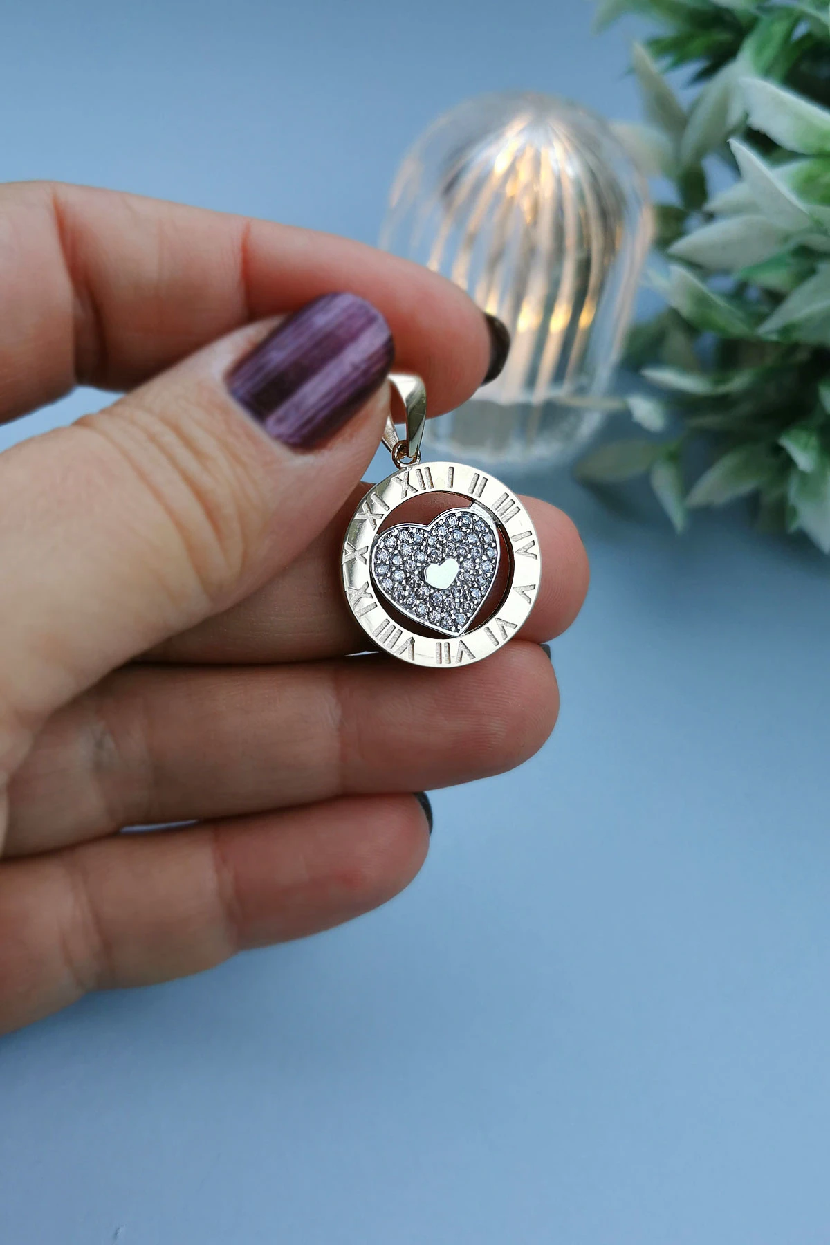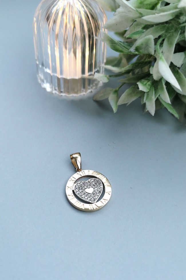 14 Ayar orta kalp kısmı hareketli, döner tasarım şık, spor ve günlük kullanıma uygun altın zirkon taşlı Roma rakalmlı kolye ucu.