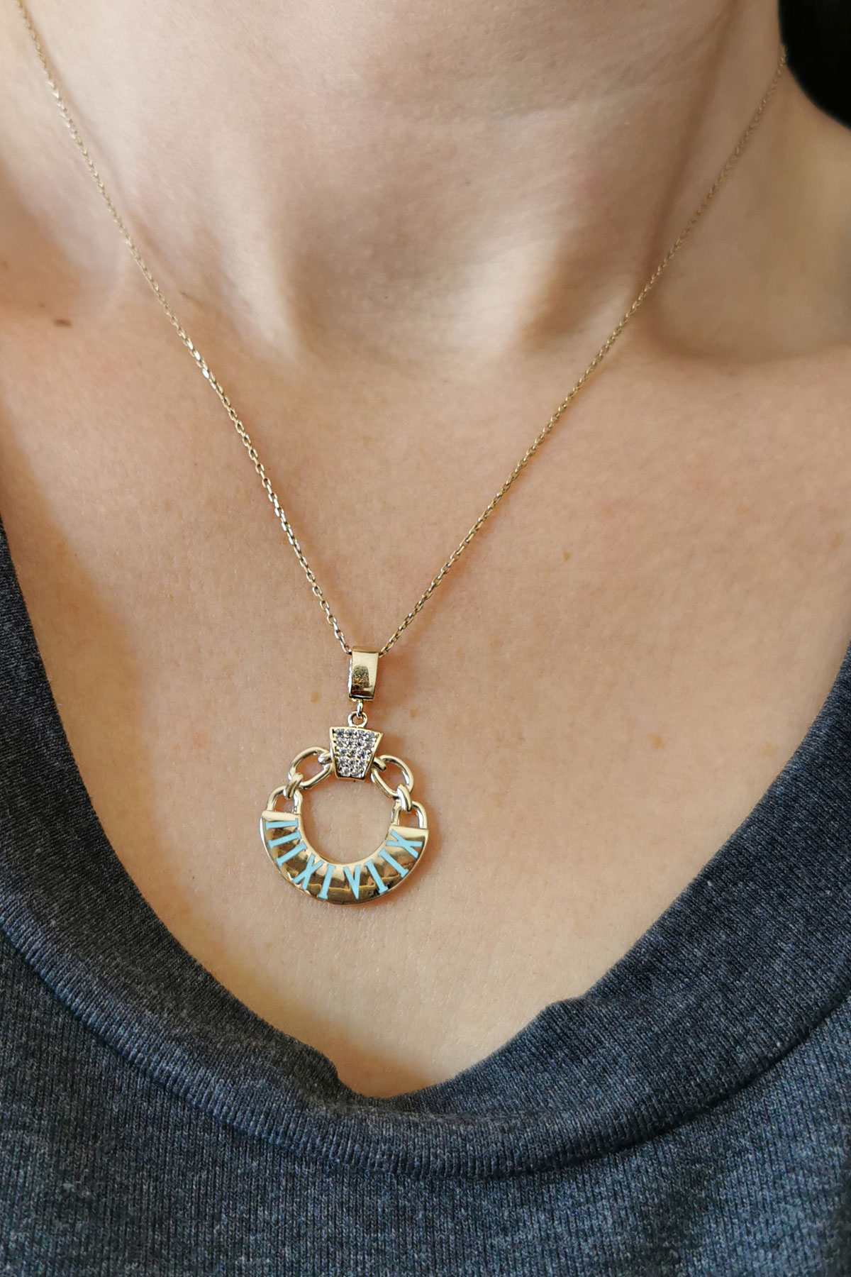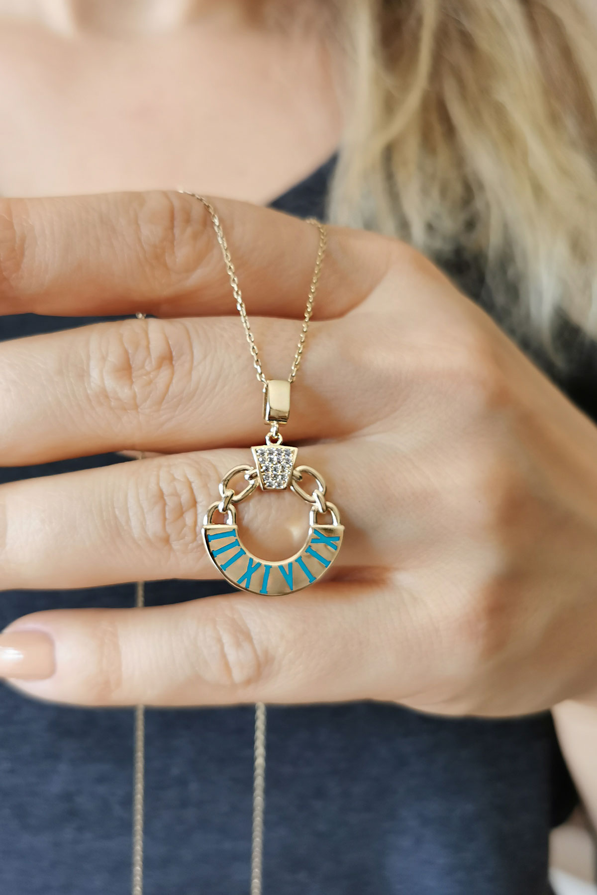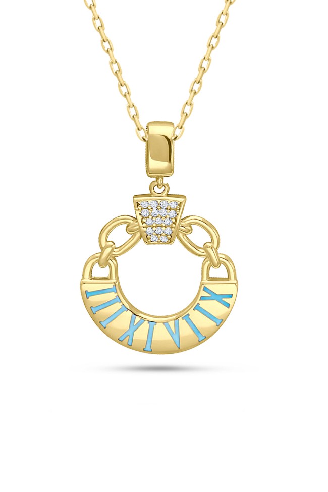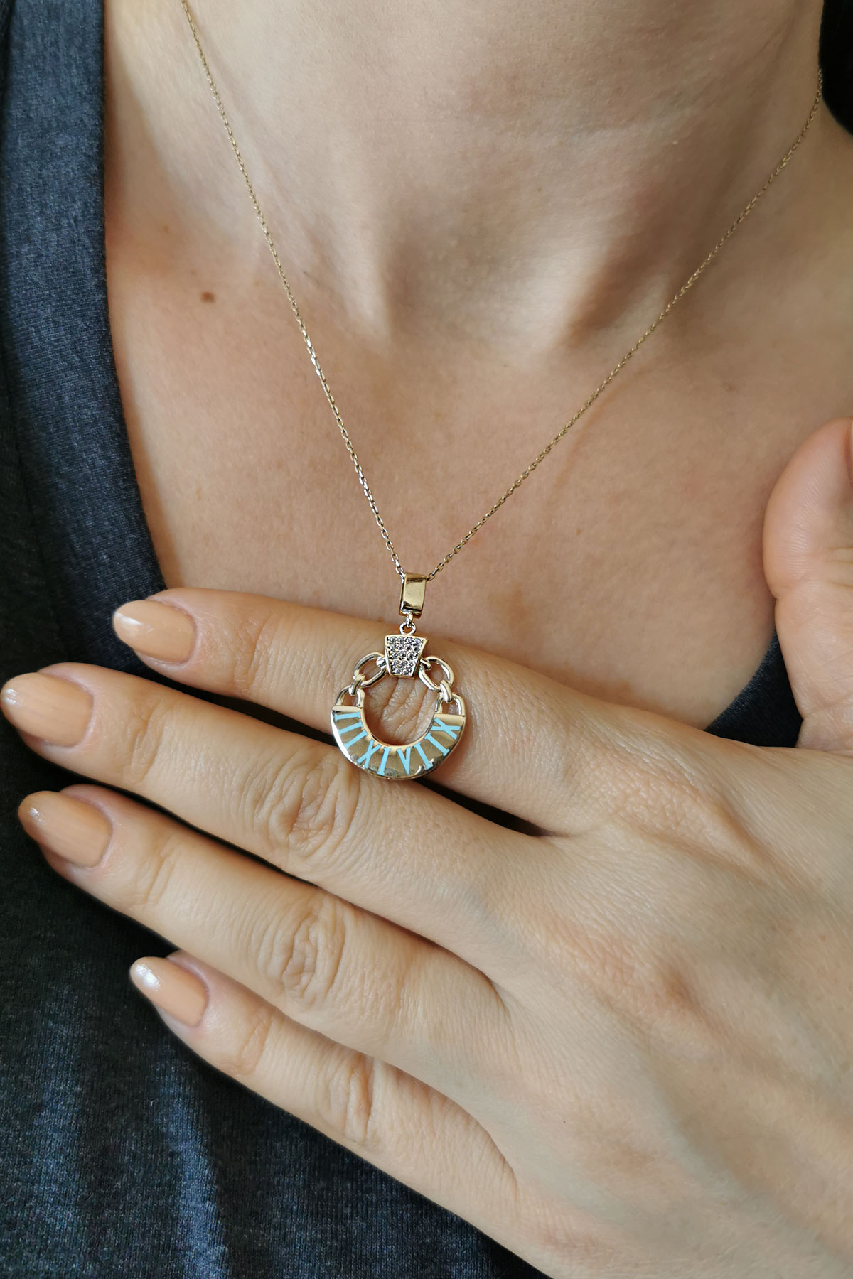 4.60 gr. 3 cm boyutunda turkuaz mineli roma rakamlı model 14 ayar altın tasarım kolye.