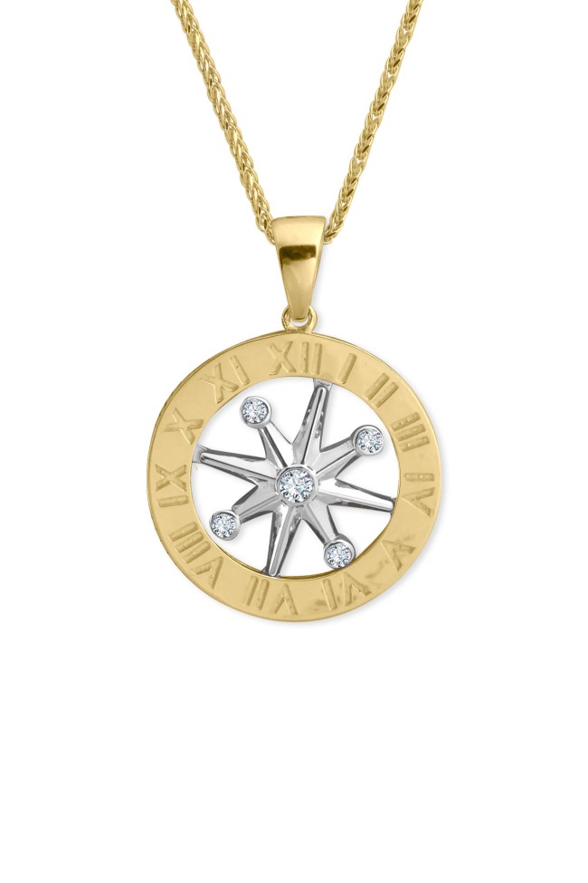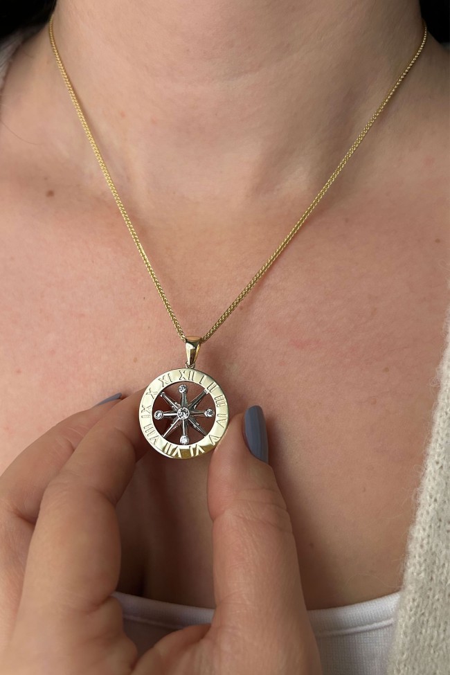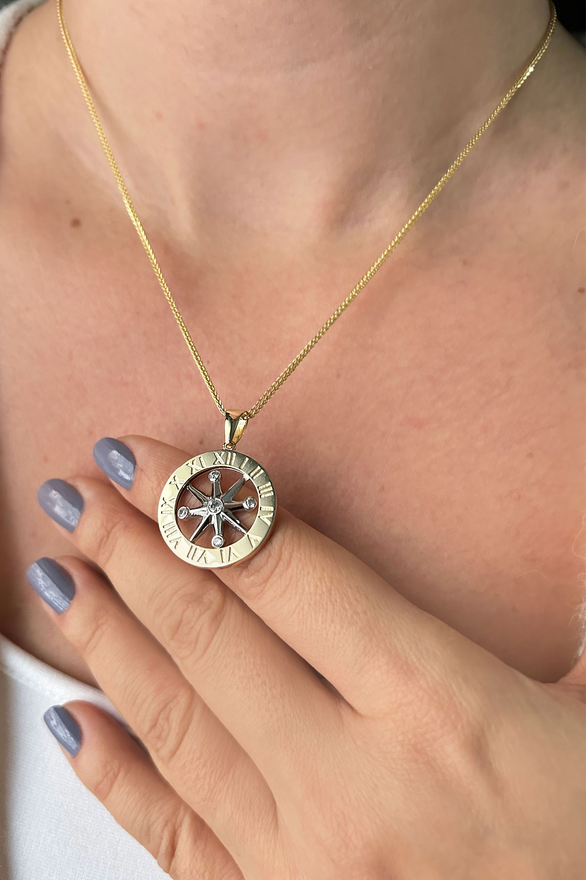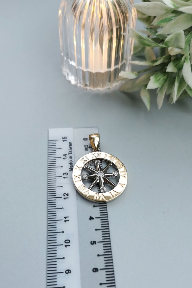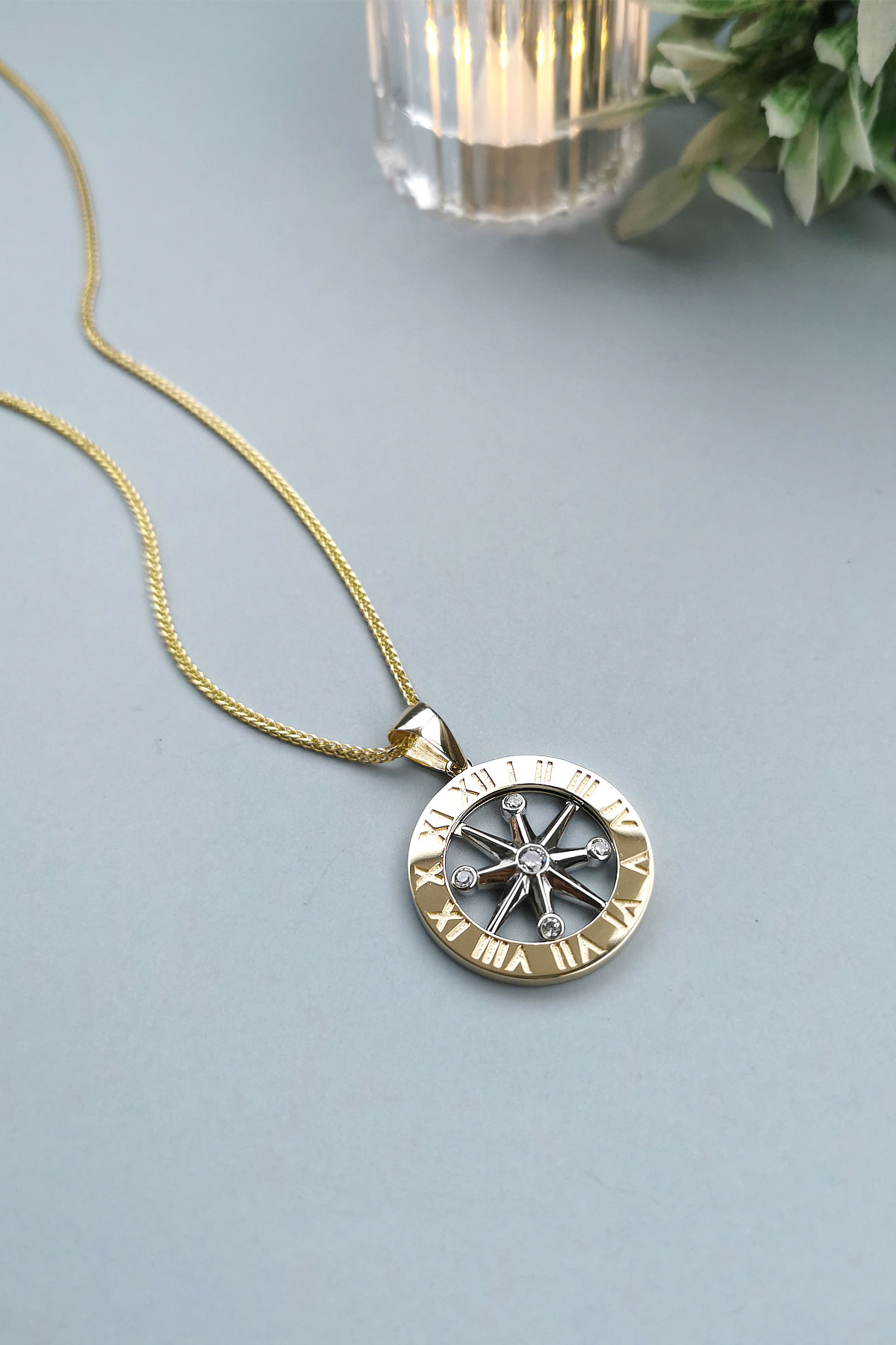 14 Ayar orta pusula kısmı hareketli, döner tasarım şık, spor ve günlük kullanıma uygun 45 cm spiga zincirli altın zirkon taşlı Roma rakalmlı kolye.