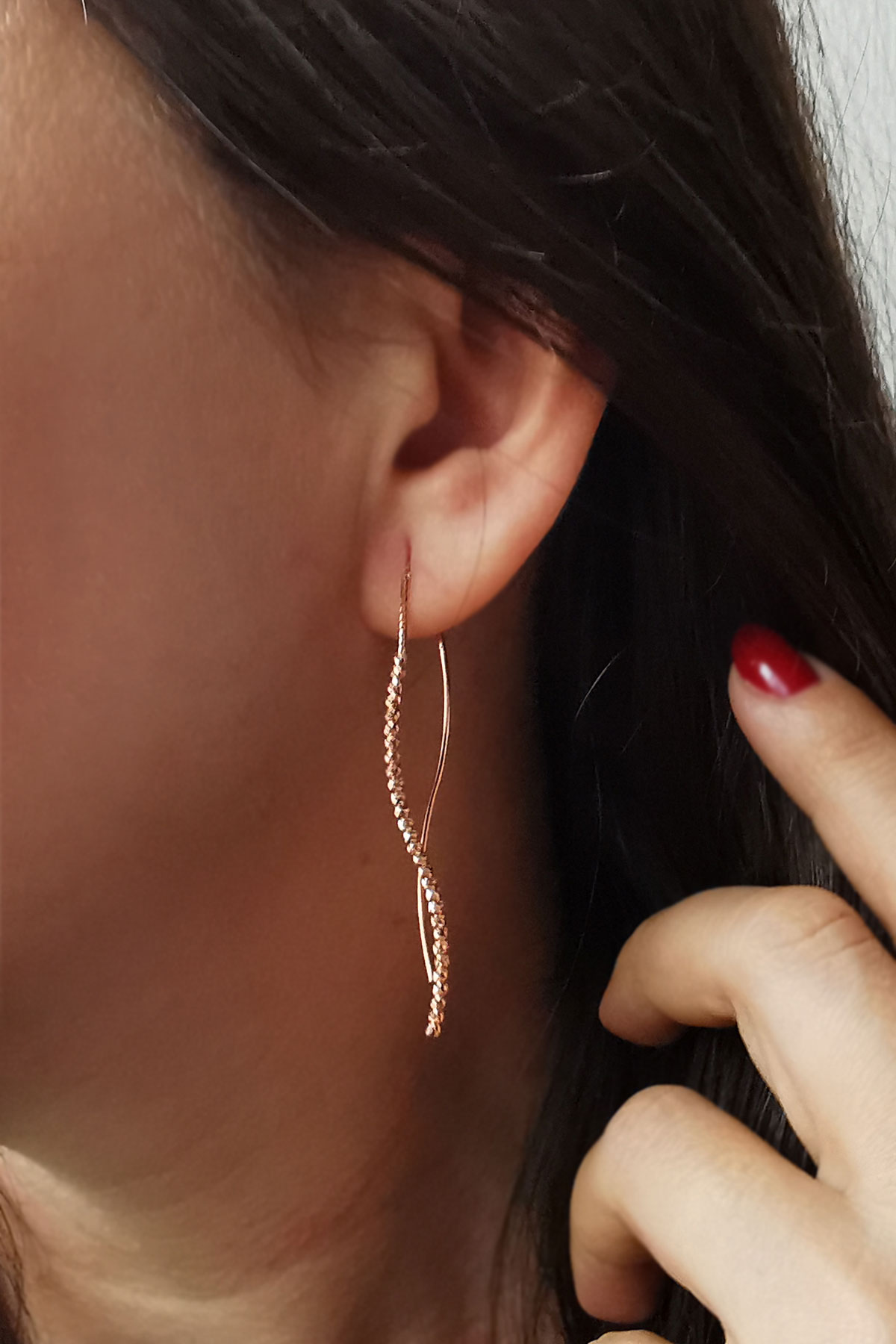 3.40 Gram Ağırlığında Dalgalı Form Tasarımıyla Zarif Detaylar İle Dikkatleri Üzerine Toplayan 14 Ayar Modern ve Şık Bir Havaya Sahip Taşsız 5.5 Cm Boyunda Sallantılı Rose Altın Küpe.