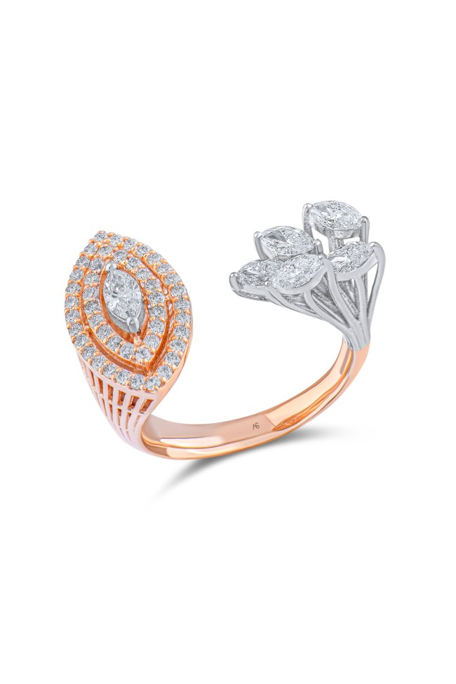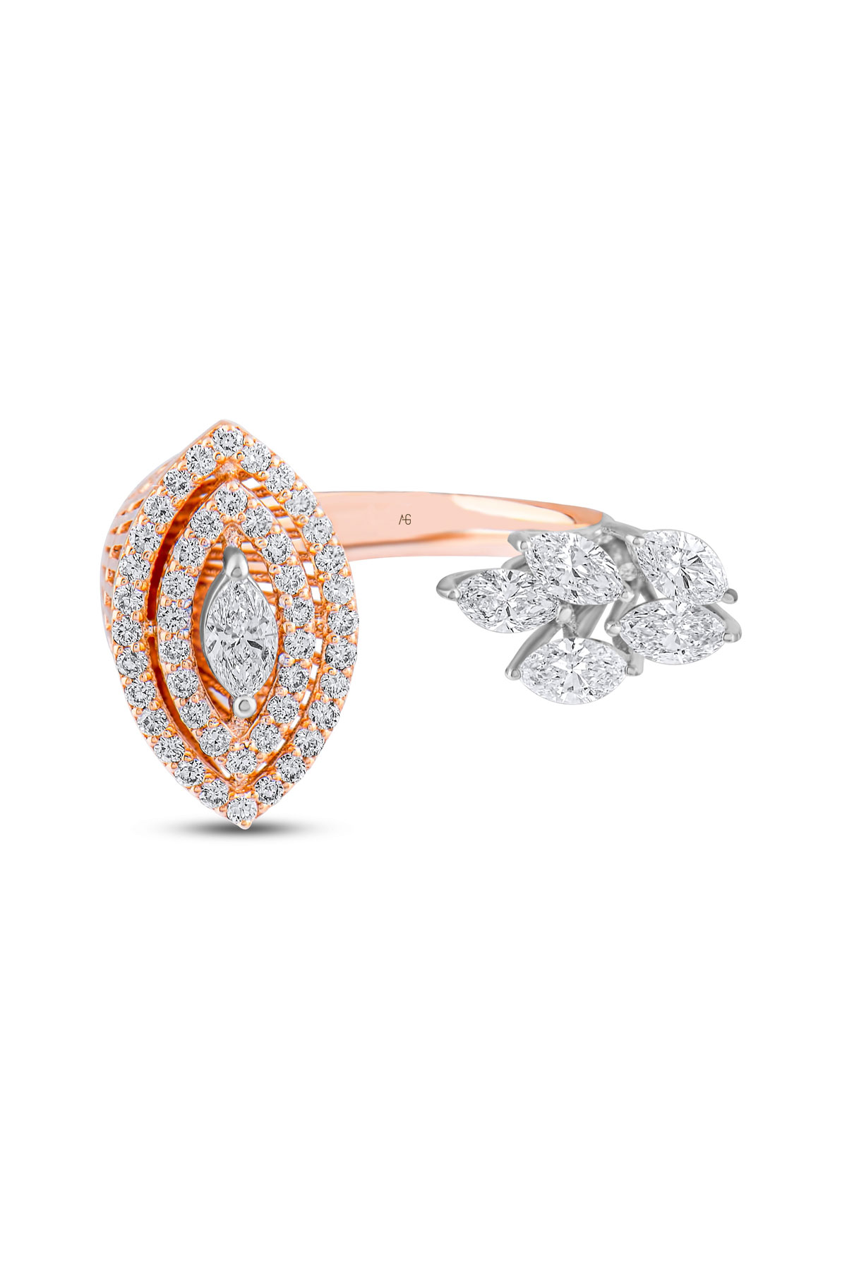 0.45 Ct. Daire, 0.95 Ct. Markiz taşlı F/VS taş detaylarına sahip 18 ayar rose gold tasarım pırlanta yüzük.
