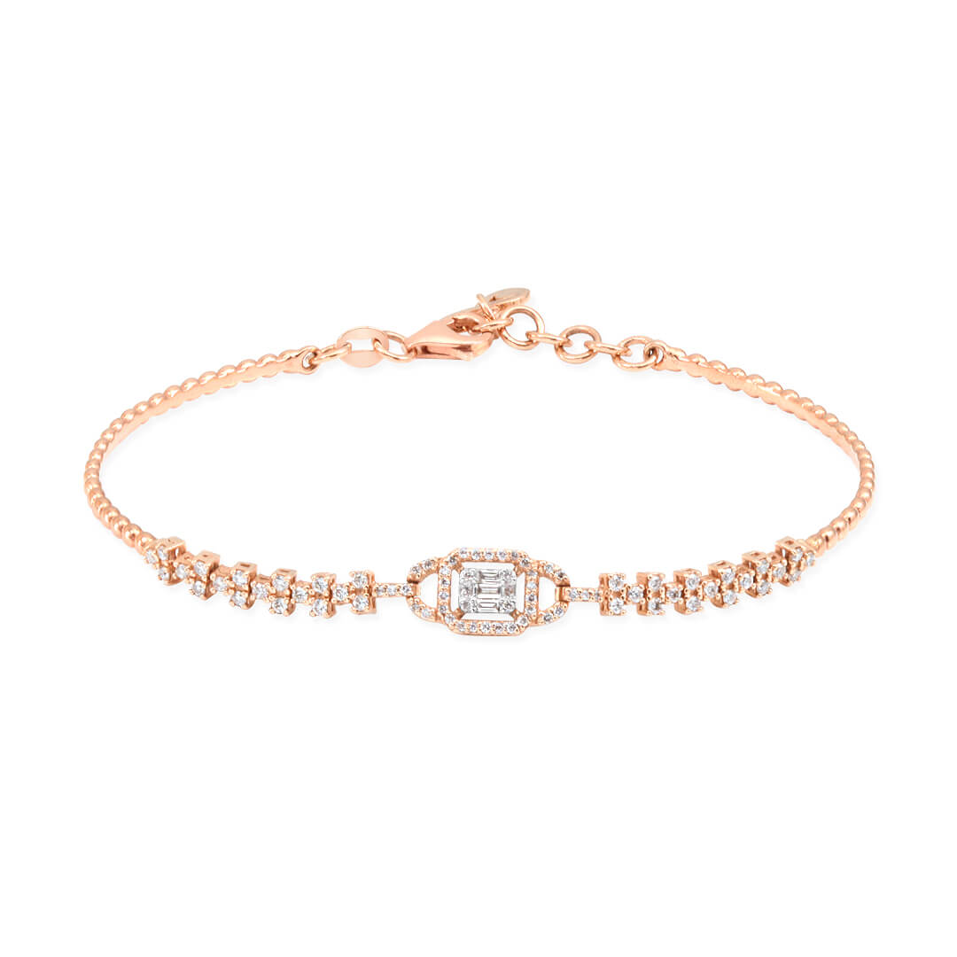 Sade ve zarif 14 ayar rose altın 0.46 ct. G/SI pırlanta baget taş detayı ile ışıltısına minimal detaylarla dokunuşları olan günlük olarak da kullanabileceğiniz ışıl ışıl modern tasarım bileklik.