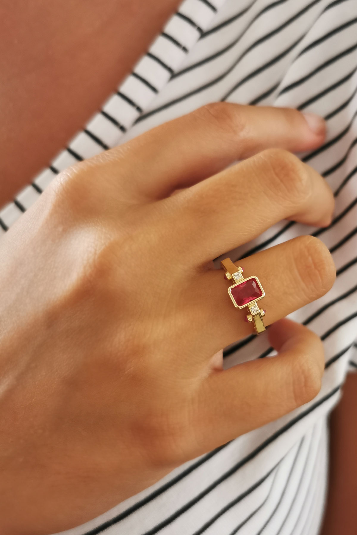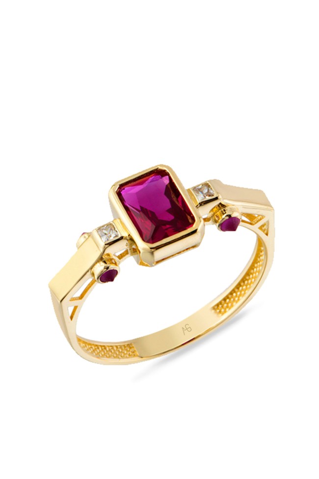 2.10 Gram Ağırlığında Zirkon Ruby Baget Taşı İle Oldukça Hoş Bir Havaya Sahip, Farklı Otantik Tarzı Olan Günlük Kullanıma Uygun 14 Ayar Altın Kadın Yüzük.
