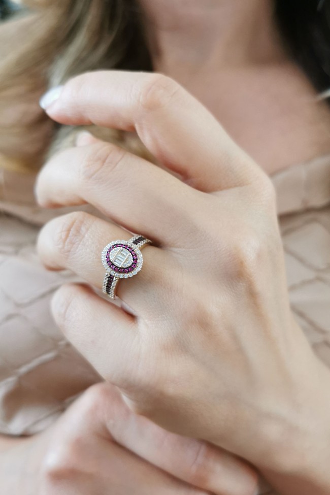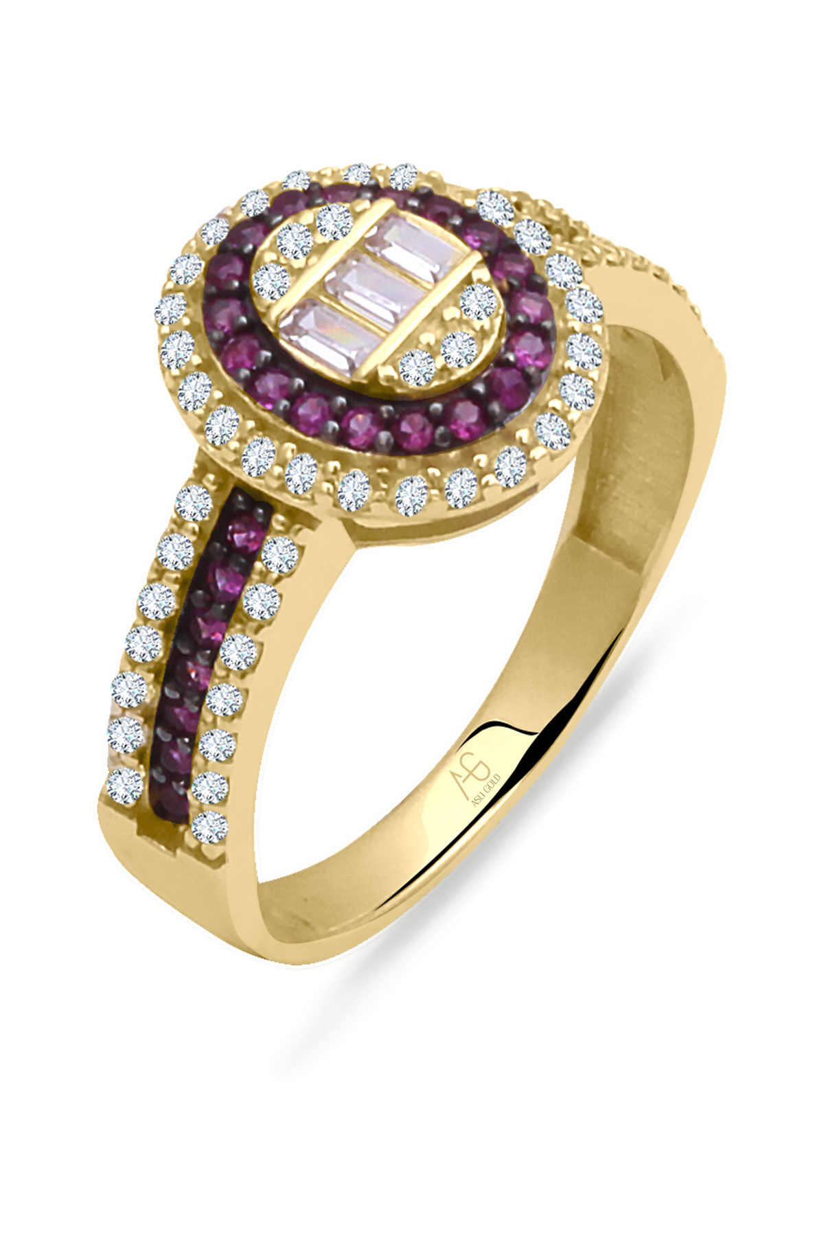 14 Ayar sarı altın baget ve yuvarlak ruby taş kombinasyonlu tasarım günlük kullanıma uygun 2.80 gram ağırlığında zirkon taşlı modern kadın yüzük.