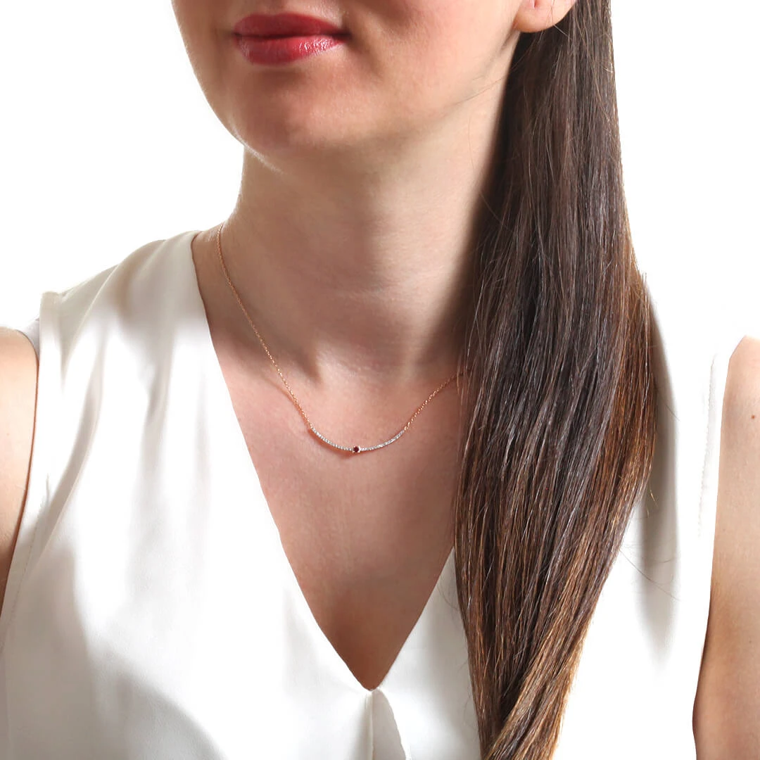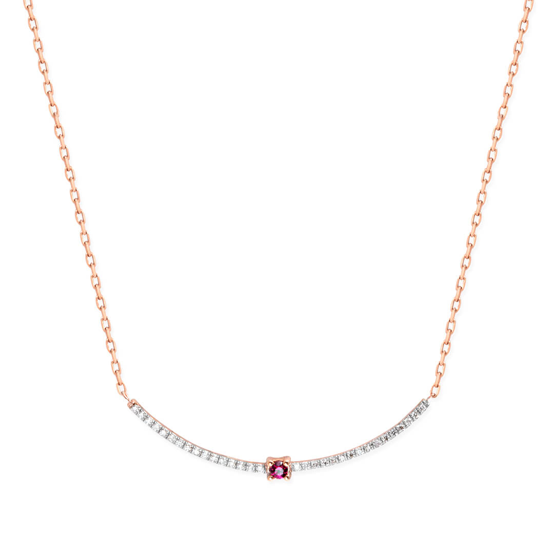 Sevgililer günü, yıl dönümü yada doğum günü gibi özel günlerin vazgeçilmez hediyesi olacak minimal ve spor tasarımlı ruby ve 0,12 karat pırlantalı 2.35 gr 14 ayar rose altın kolye.