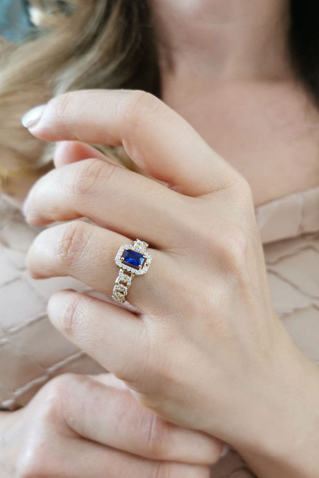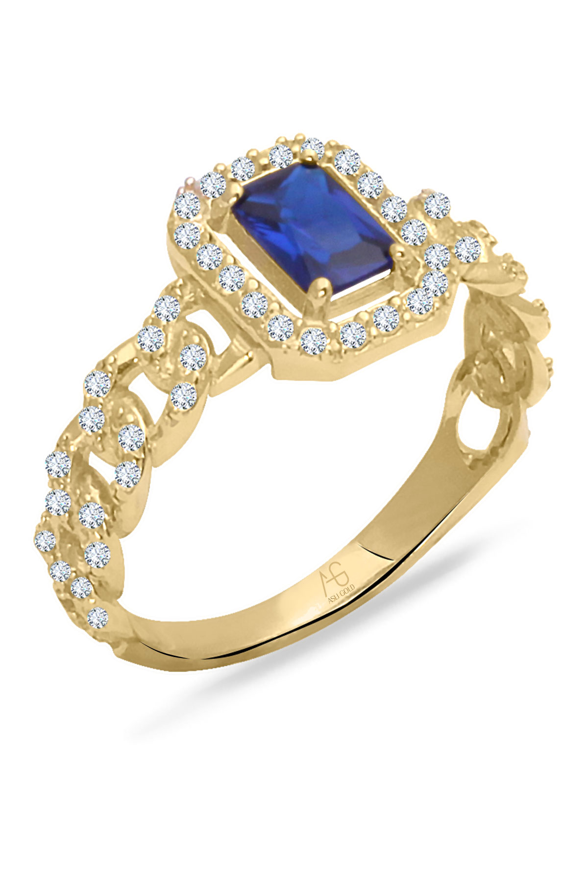 14 Ayar sarı altın, baget kesim, zirkon safir taş tasarım günlük kullanıma uygun 2.45 gram ağırlığında modern kadın yüzük.