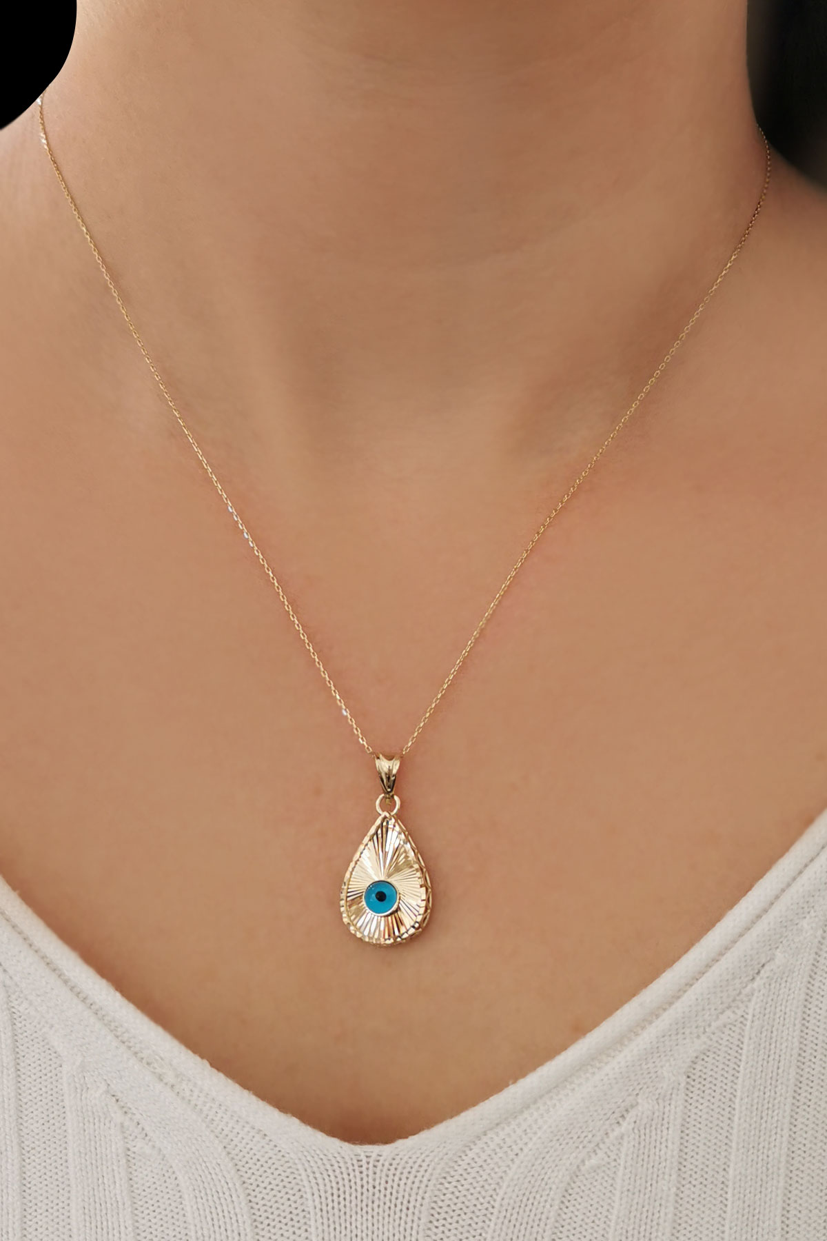 14 Ayar nazardan korunmanın en şık hali olarak tabir edebileceğimiz ışıl ışıl tasarıma sahip günlük kullanıma uygun farklı kolyelerinizle bir arada kombine olarak da kullanabileceğiniz damla form 1.50 gram ağırlığında göz altın kolye ucu.