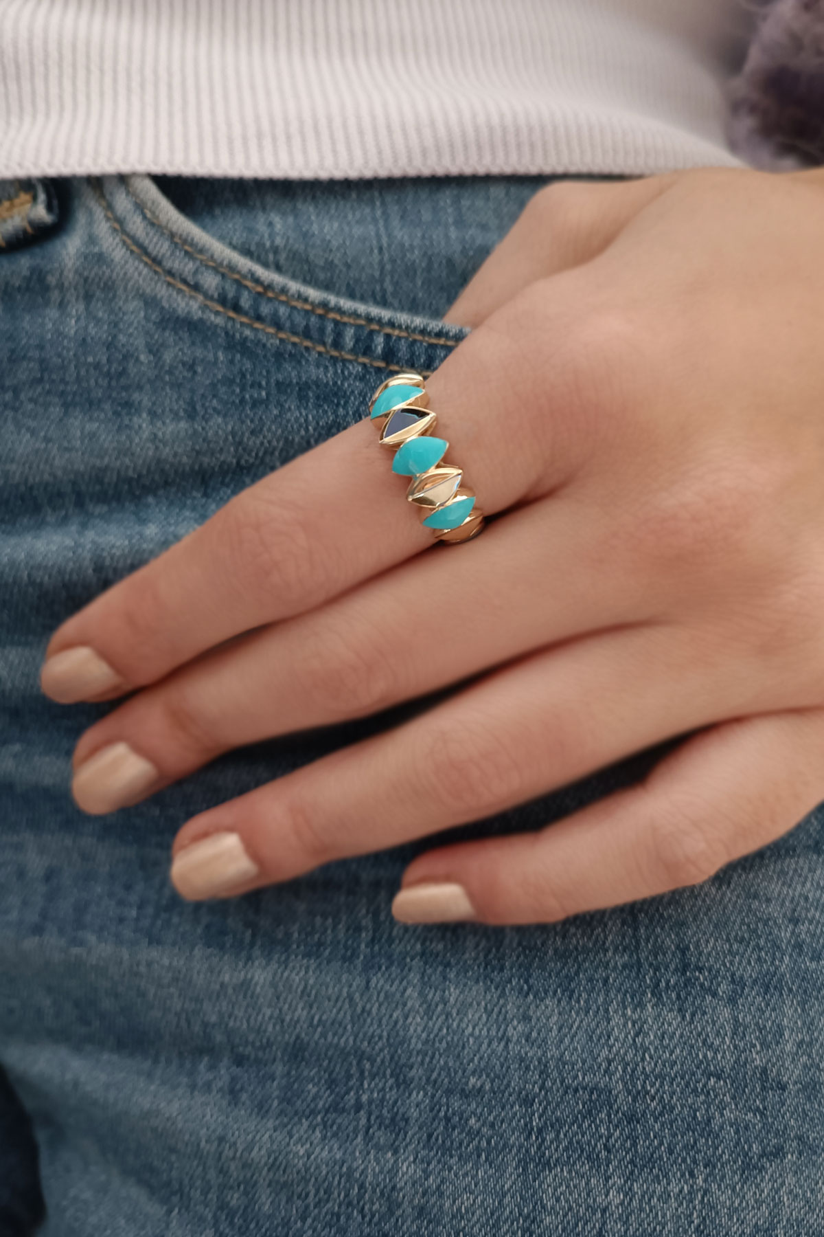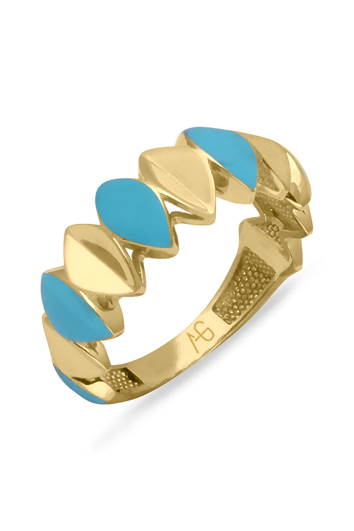 14 Ayar modern badem tasarımı ile farklı duruşa sahip firuze atlamalı mineli taşsız model, sevdiklerinize yada kendinize armağan olarak tercih edebileceğiniz modern tasarım günlük kullanıma uygun 3.40 gram ağırlığında kombin yüzük.