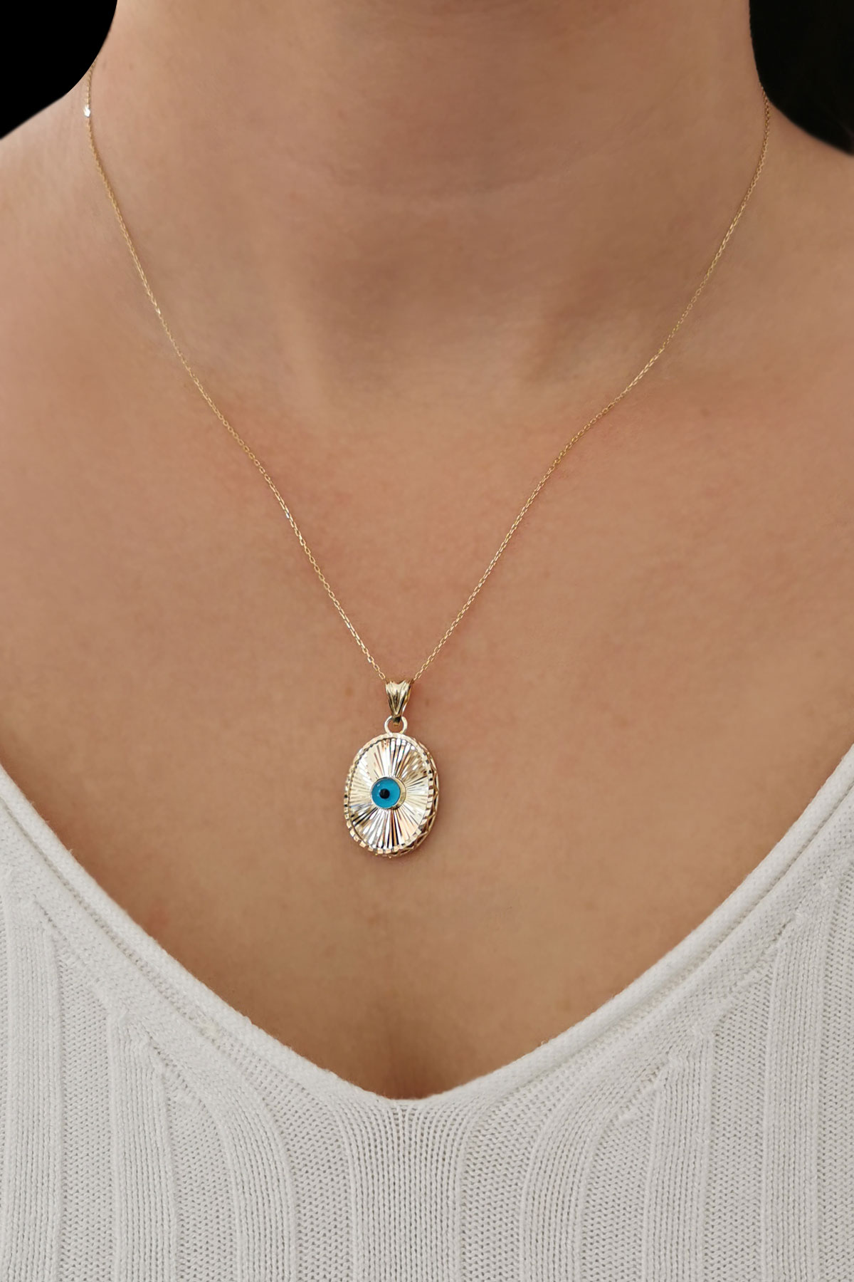 14 Ayar nazardan korunmanın en şık hali olarak tabir edebileceğimiz minimal tasarıma sahip günlük kullanıma uygun farklı kolyelerinizle bir arada kombine olarak da kullanabileceğiniz 2.95 gram ağırlığında oval göz altın kolye.