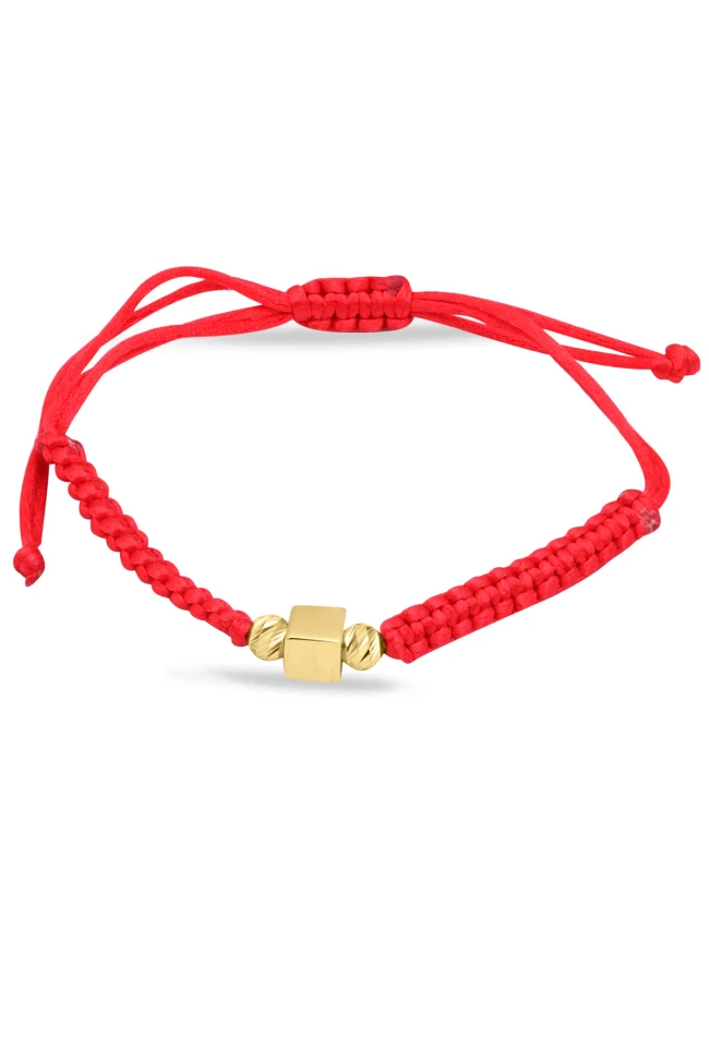 Çift toplu küp detaylı tasarımı ile günlük olarak da kullanabileceğiniz, özel günlerinde sevdiklerinize şık bir hediye seçeneği olacak 0.75 gr ağırlığında 14 ayar altın taşsız saten kırmızı özel örgü ip detaylı unisex kullanıma uygun spor bileklik.
