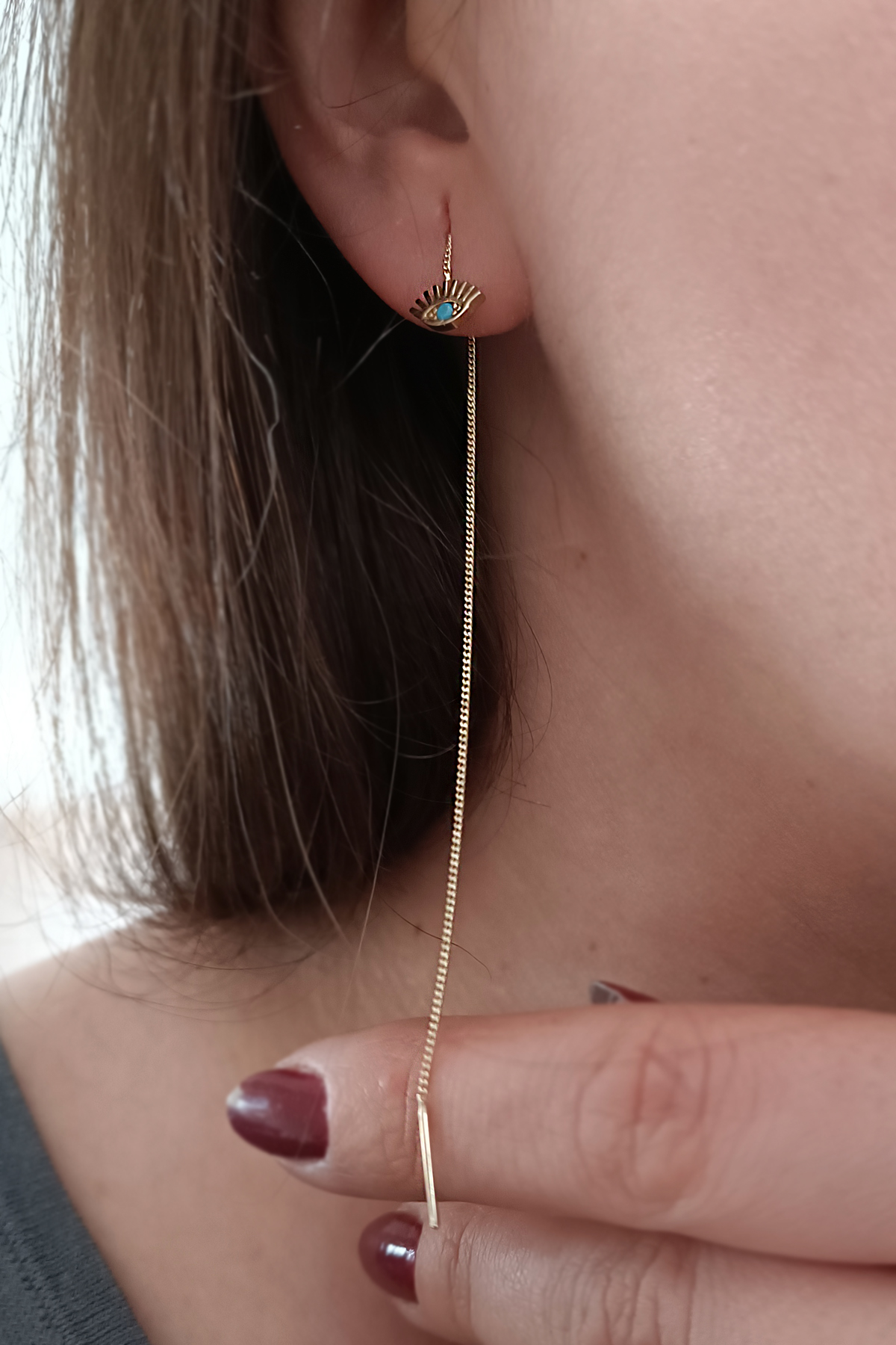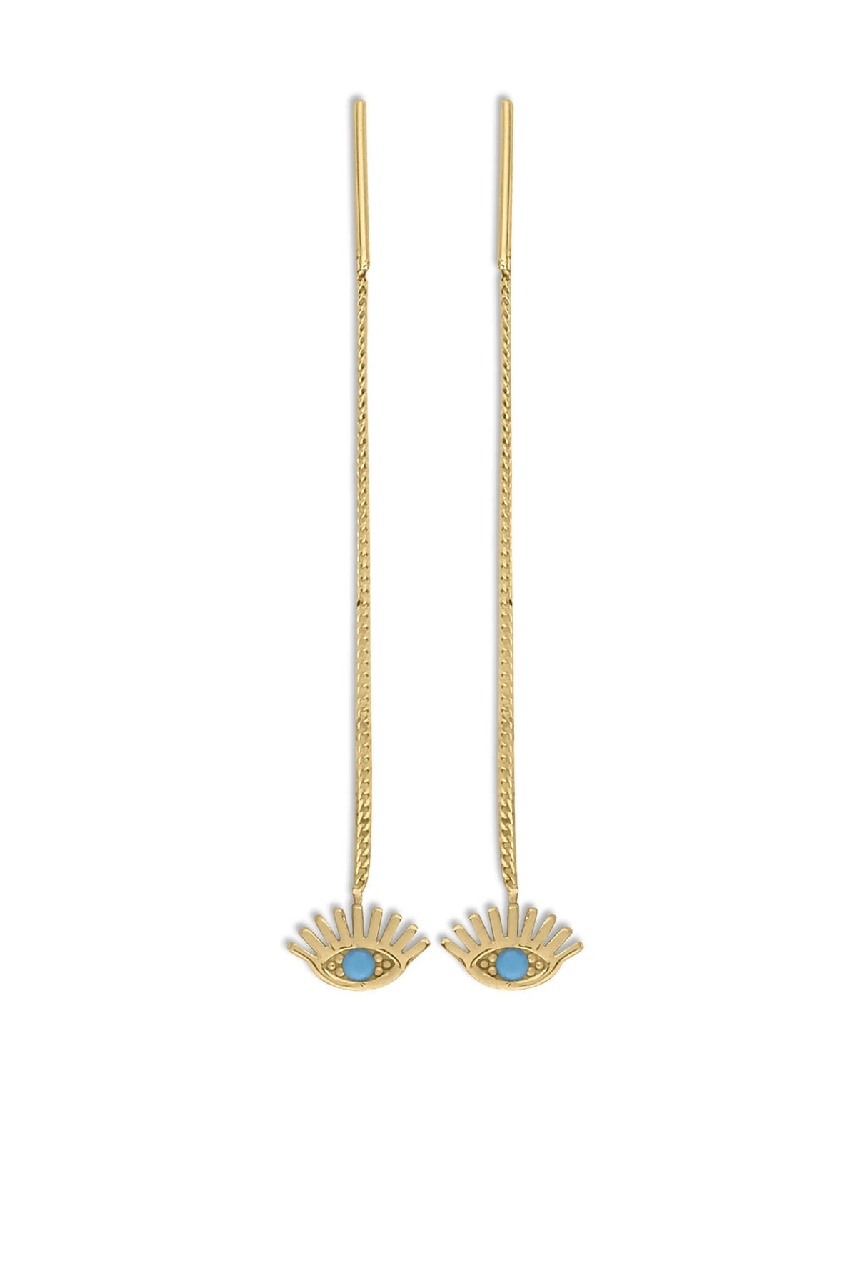 14 Ayar göz kirpik tasarımı ile günlük olarak kullanabileceğiniz 12 cm uzunluğunda spor bir modele sahip 1.40 gram ağırlığında altın zincir sallantılı küpe.