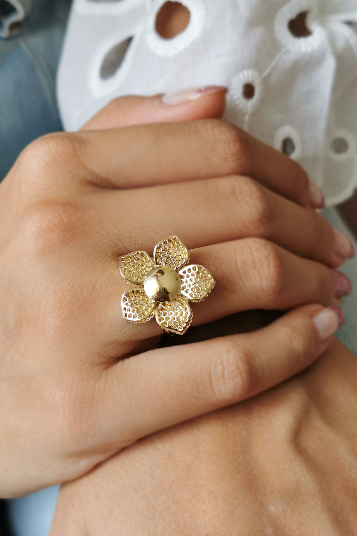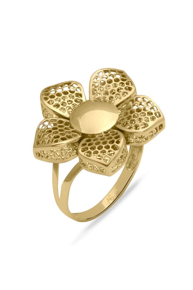 3.15 Gram Ağırlığında Petekli Çiçek Tasarımlı Şık Bir Duruşa Sahip Dolgun 14 Ayar Altın İtalyan Yüzük.