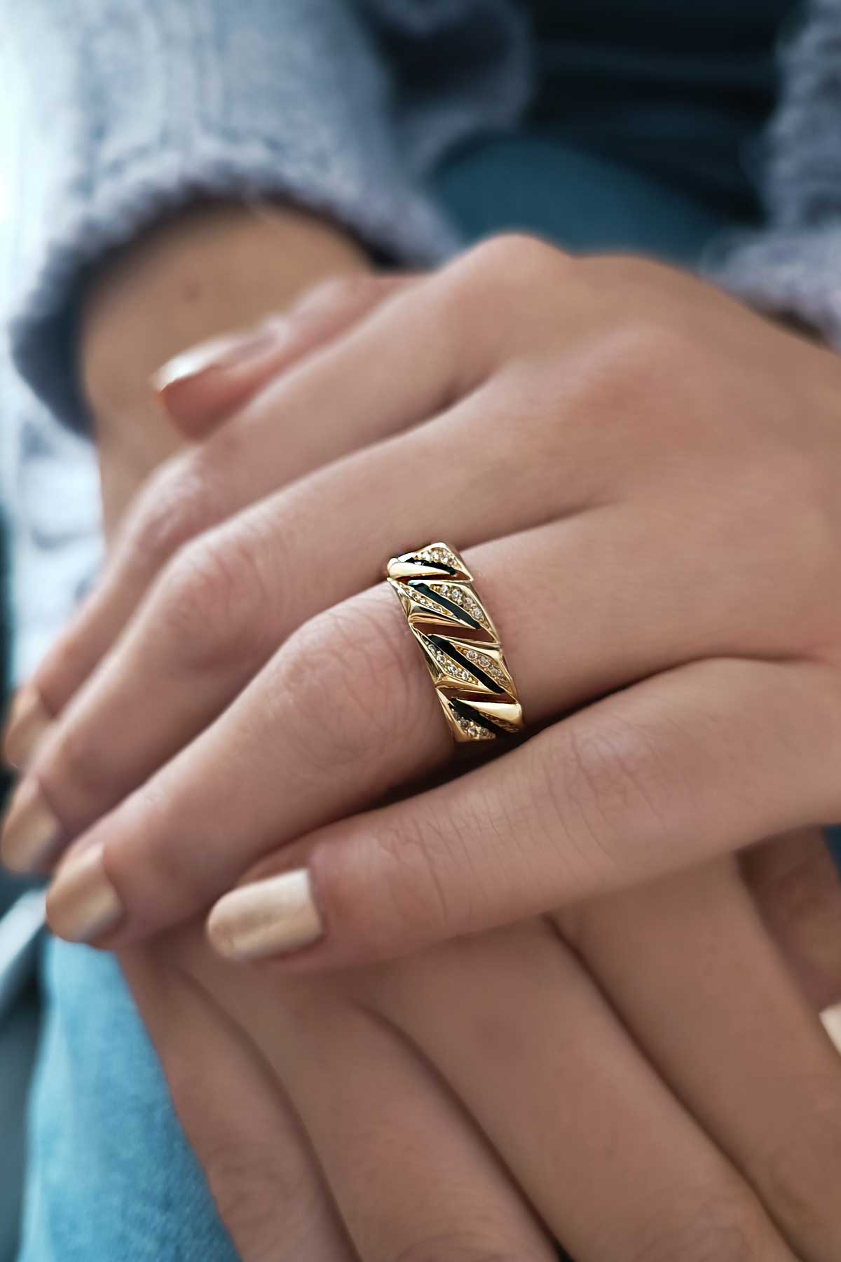 14 Ayar modern, spor duruşa sahip siyah şerit mine detaylı taşlı ışıl ışıl model, sevdiklerinize yada kendinize armağan olarak tercih edebileceğiniz modern tasarım günlük kullanıma uygun 4.00 gram ağırlığında farklı model yüzüklerinizle bir arada da kullanabileceğiniz altın kombin yüzük.