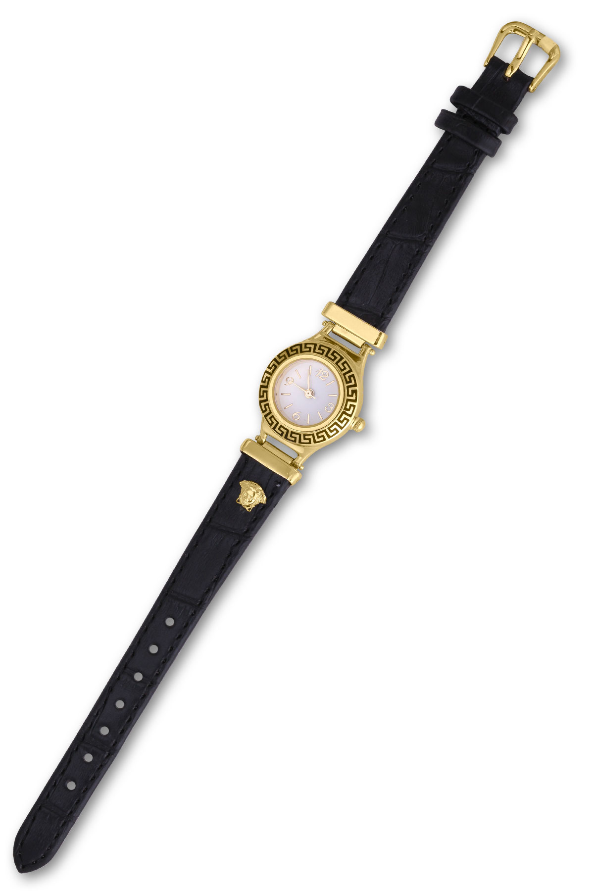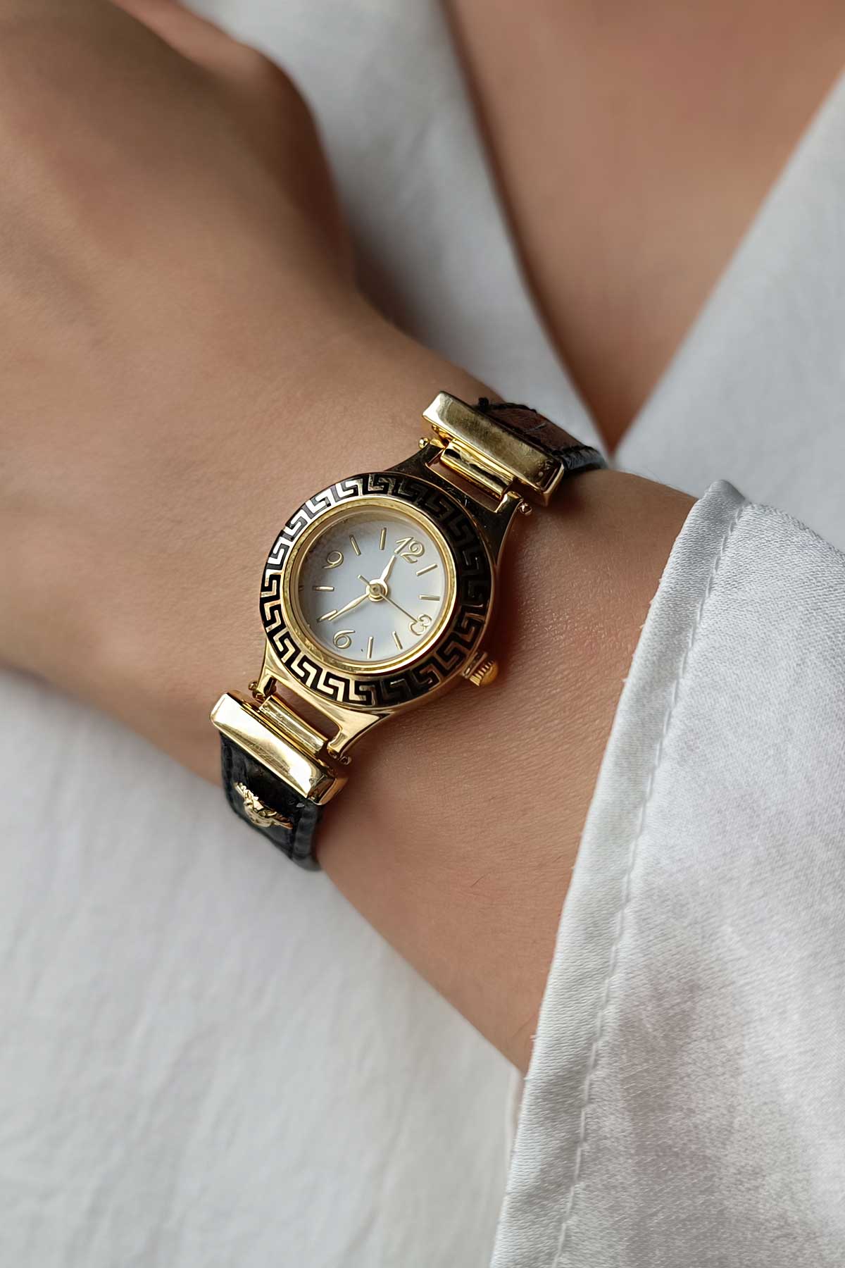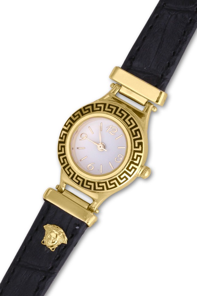 14 Ayar bir kadın için en şık aksesuar olarak tabir edebileceğimiz versage detaylı siyah kayışlı harika bir tasarıma sahip günlük kullanıma uygun 7.94 gram ağırlığında altın saat.