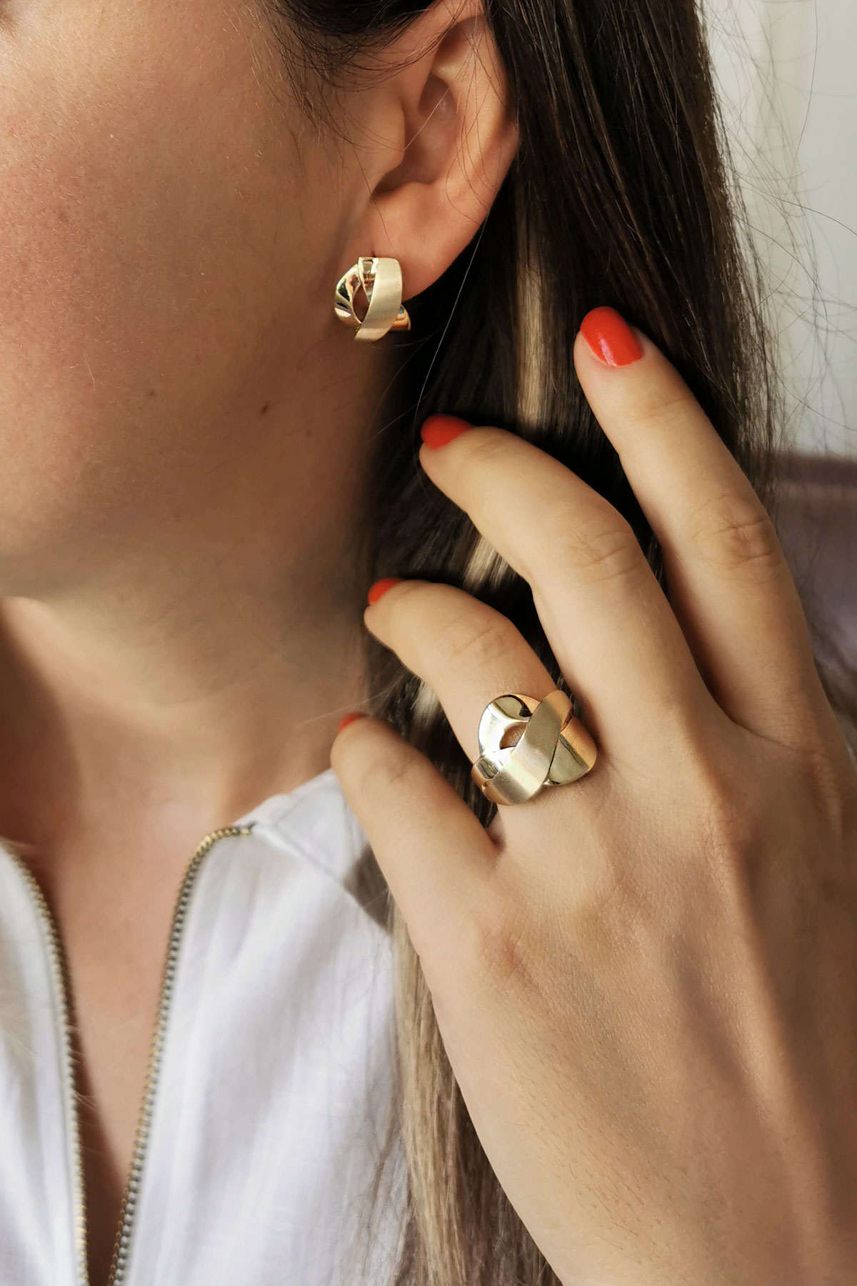 10.00 Gram Ağırlığında Taşsız Bant Geçişleri İle Oldukça Hoş Bir Havaya Sahip, Gösterişli Ve Günlük Kullanıma Uygun 14 Ayar Altın Kadın Yüzük Küpe Takım.