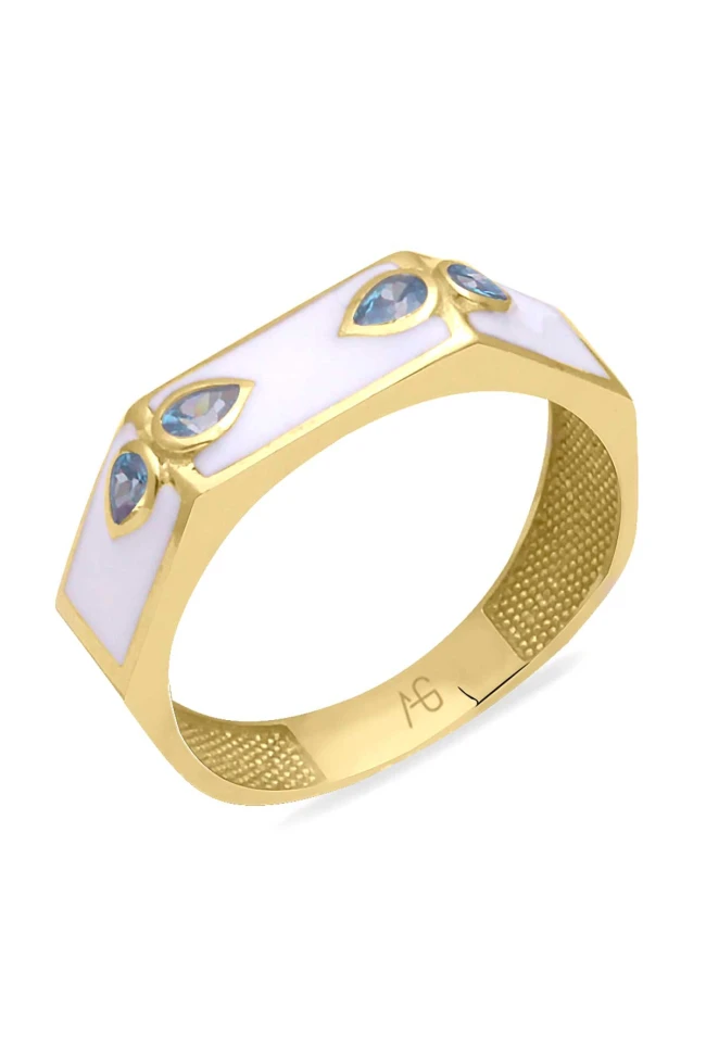 14 Ayar modern tasarımı ile zarif duruşa sahip aqua marine damla taş detaylı beyaz mineli model, sevdiklerinize yada kendinize armağan olarak tercih edebileceğiniz modern tasarım günlük kullanıma uygun 2.60 gram ağırlığında farklı model yüzüklerinizle bir arada da kullanabileceğiniz altın kombin yüzük.