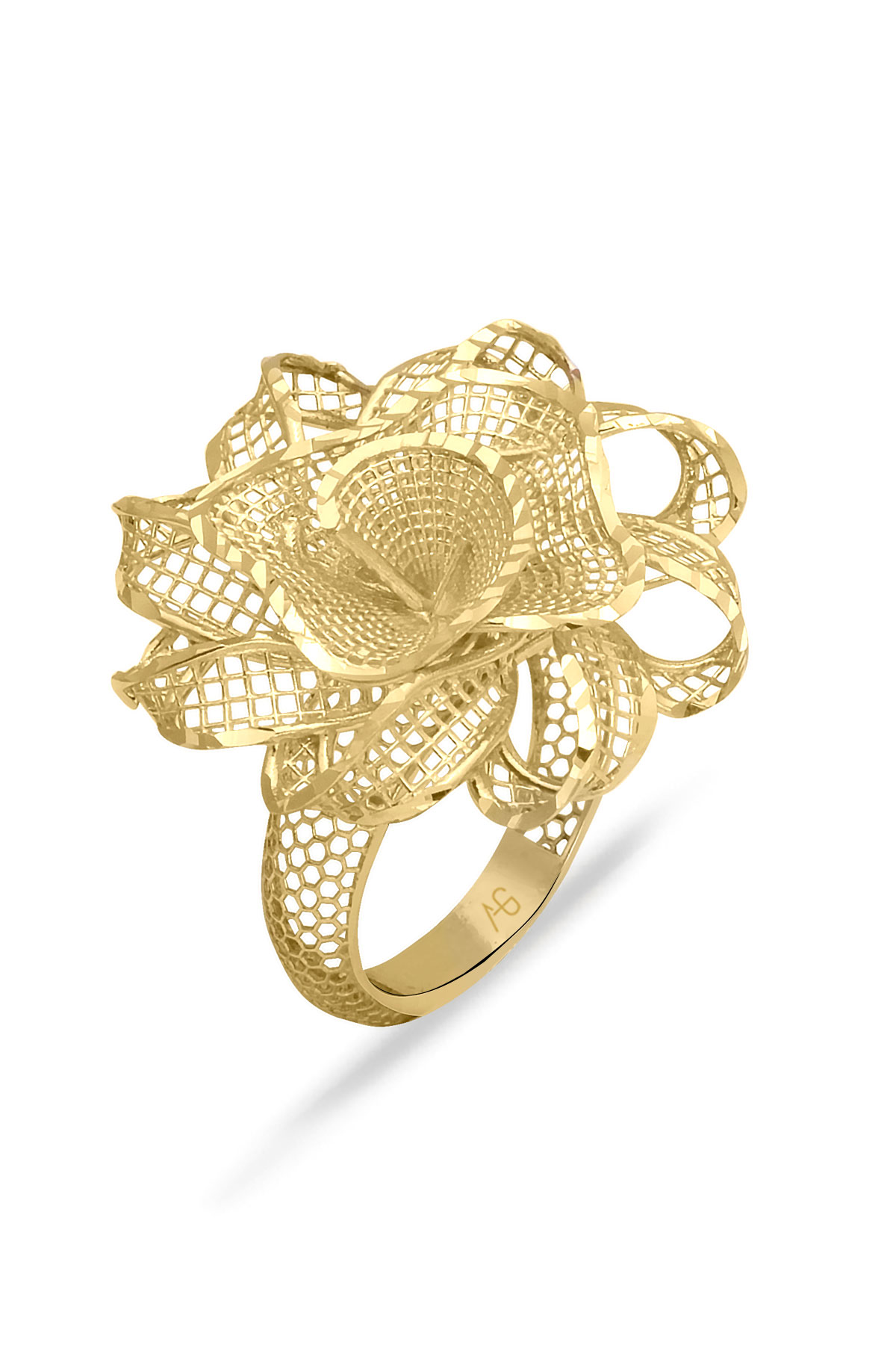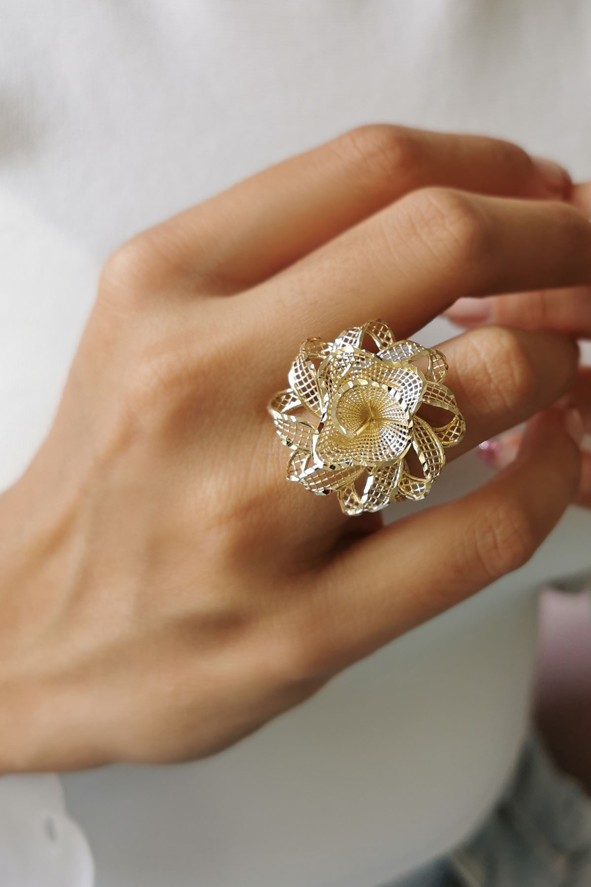 5.05 Gram Ağırlığında Dantel İşleme Elektro Füzyon Çiçek Tasarımlı Şık Bir Duruşa Sahip Gösterşli 14 Ayar Altın İtalyan Yüzük.