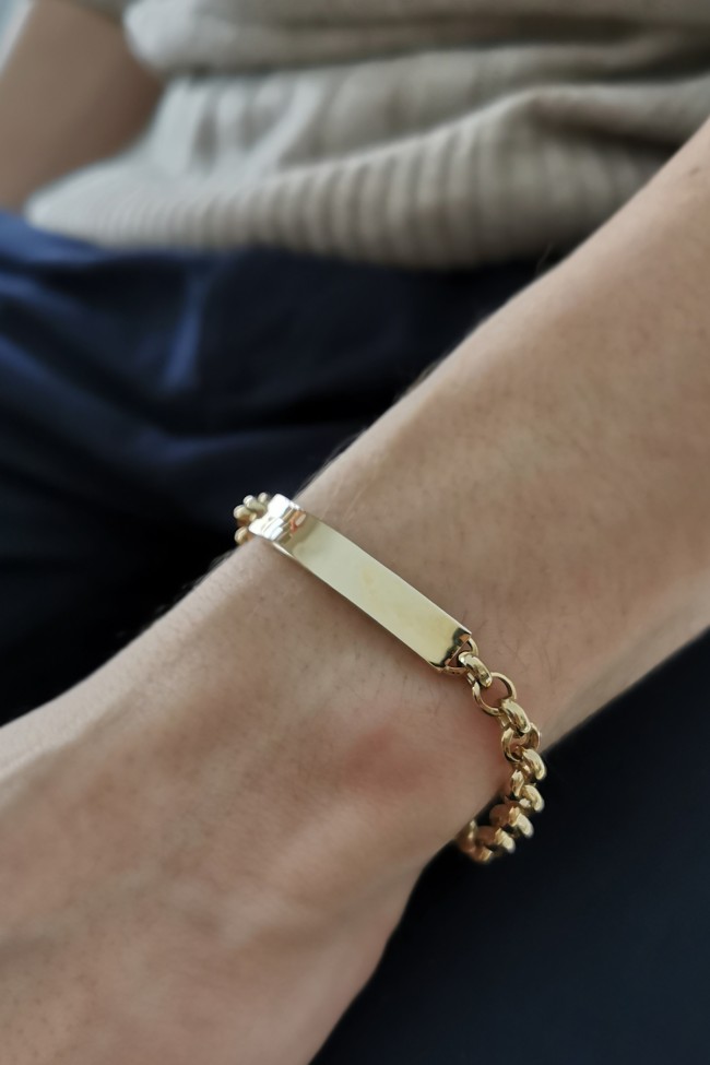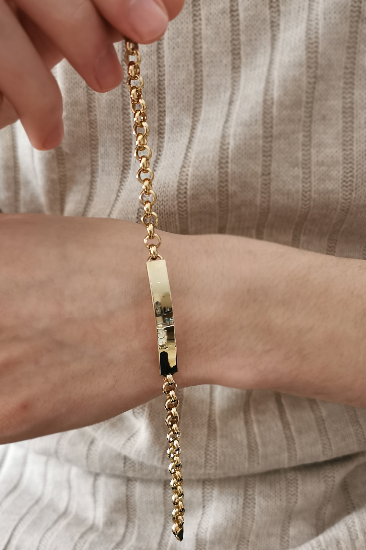 Künye olarak tasarlanmış oldukça spor duran gurmet zincir model detaylı taşsız tasarım, günlük kullanıma uygun, özel günlerinde sevdiklerinize şık bir hediye seçeneği olacak 6.60 gr ağırlığında 14 ayar altın erkek künye bileklik.