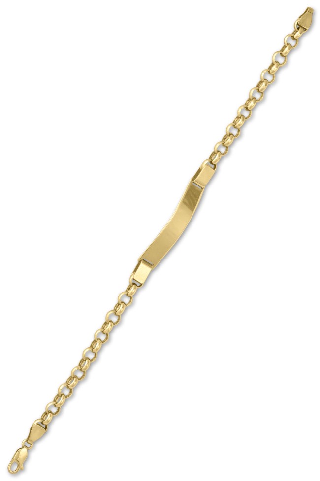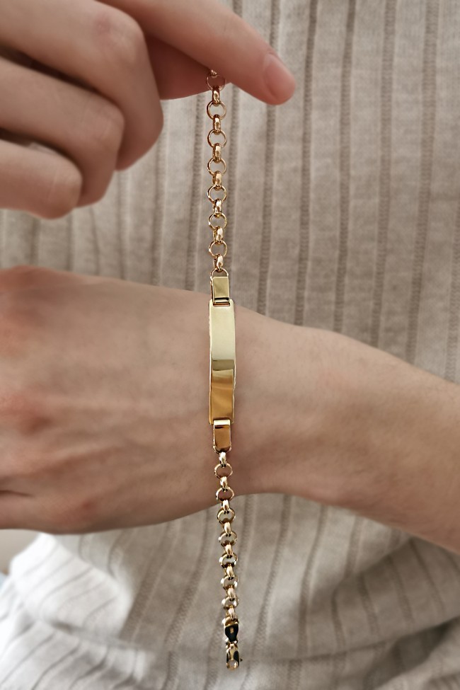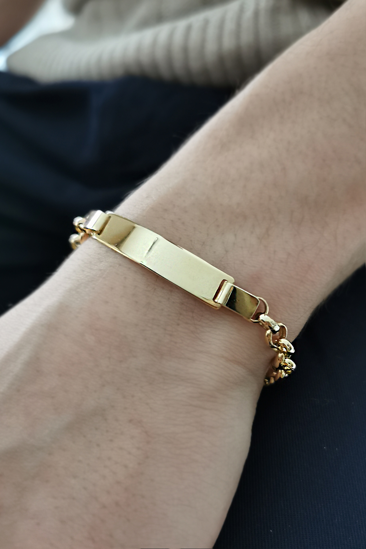 Künye olarak tasarlanmış oldukça spor duran halkalı doc zincir model detaylı taşsız tasarım, günlük kullanıma uygun, özel günlerinde sevdiklerinize şık bir hediye seçeneği olacak 8.95 gr ağırlığında 14 ayar altın erkek künye bileklik.