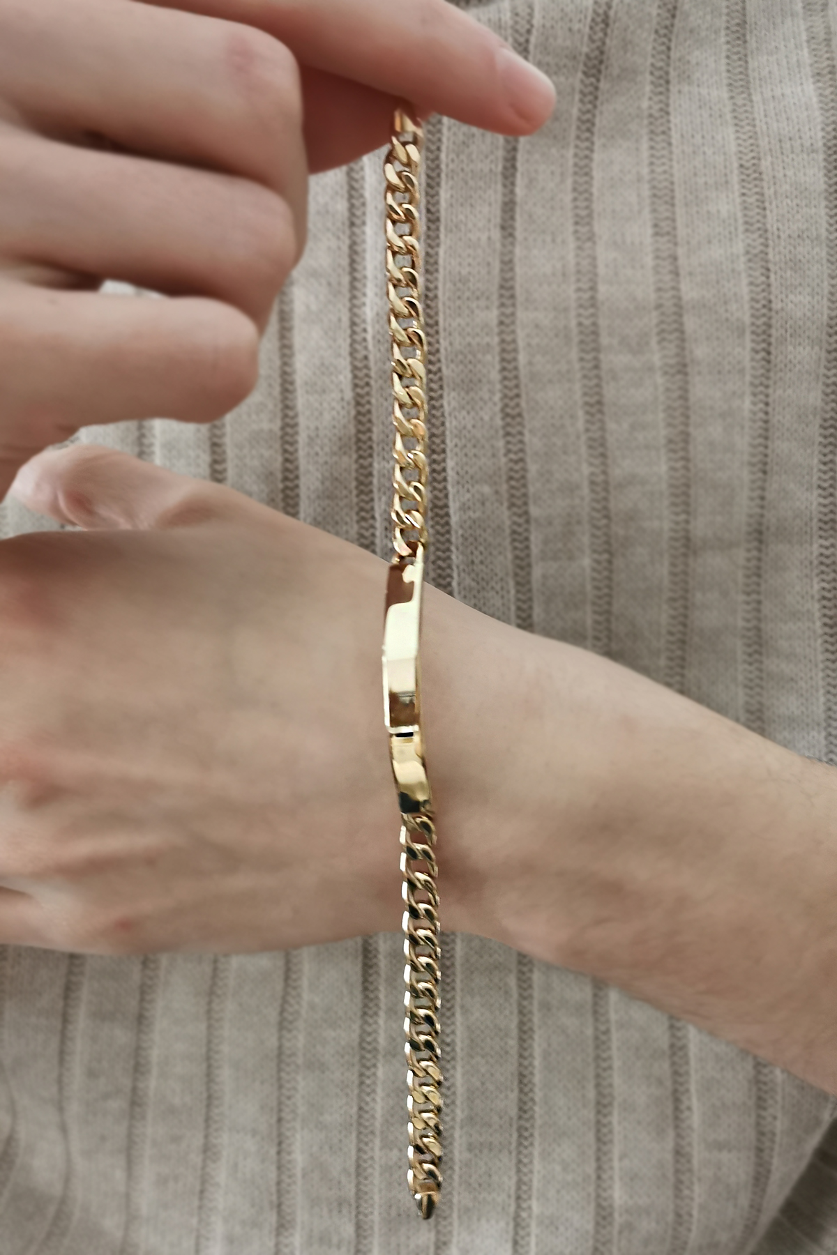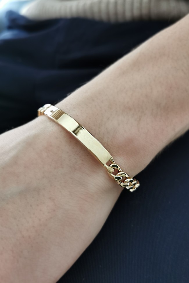 Künye olarak tasarlanmış oldukça spor duran gurmet zincir model detaylı taşsız tasarım, günlük kullanıma uygun, özel günlerinde sevdiklerinize şık bir hediye seçeneği olacak 8.55 gr ağırlığında 14 ayar altın erkek künye bileklik.