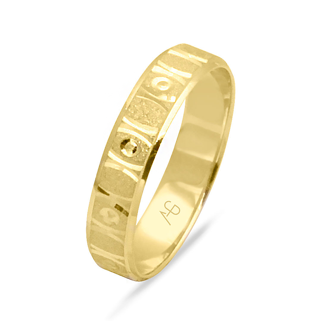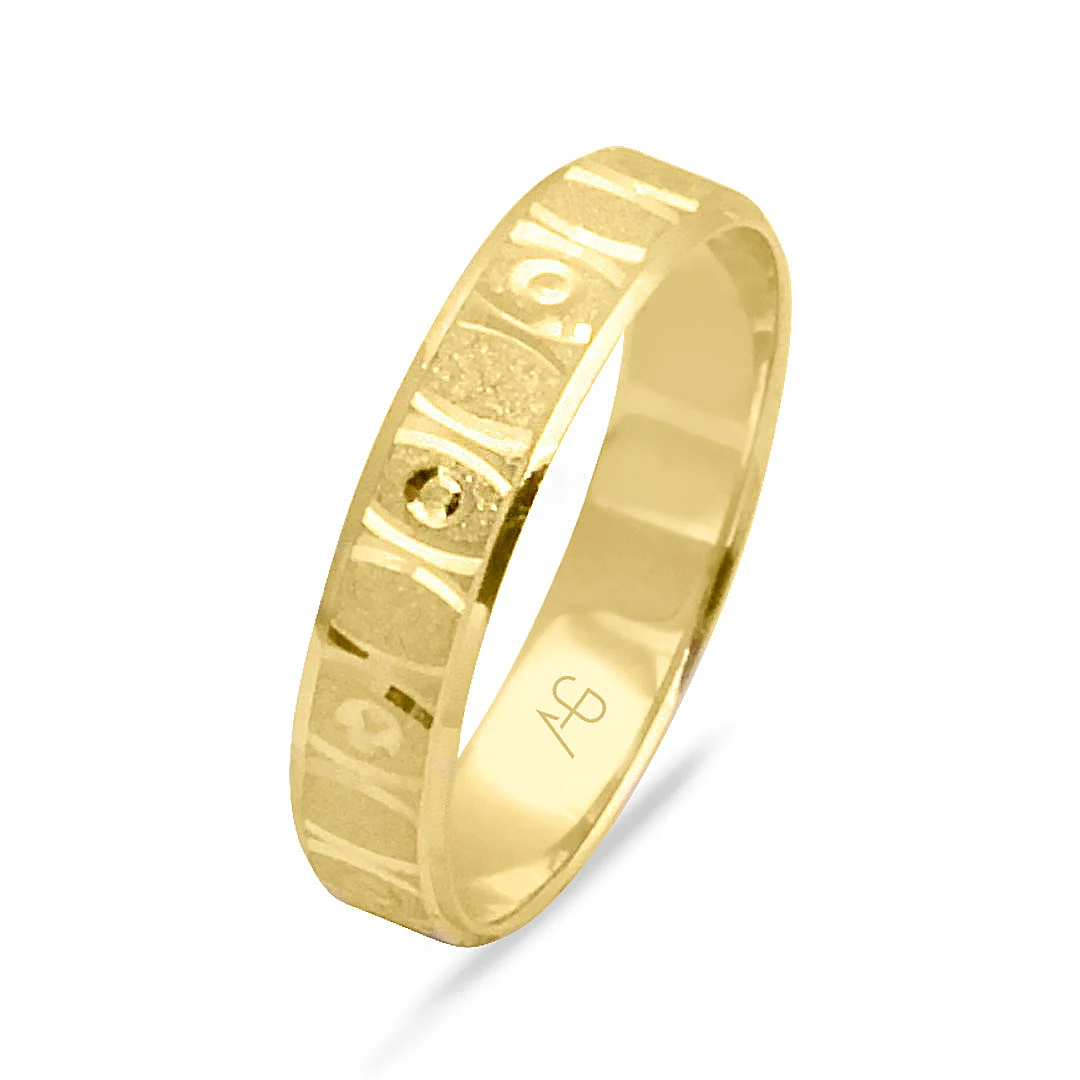 14 Ayar sarı altın desenli modeliyle şık duruşa sahip günlük kullanıma uygun 2.00 gram ağırlığında taşsız hem kadın hem erkek unisex tasarım alyans.