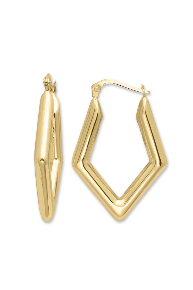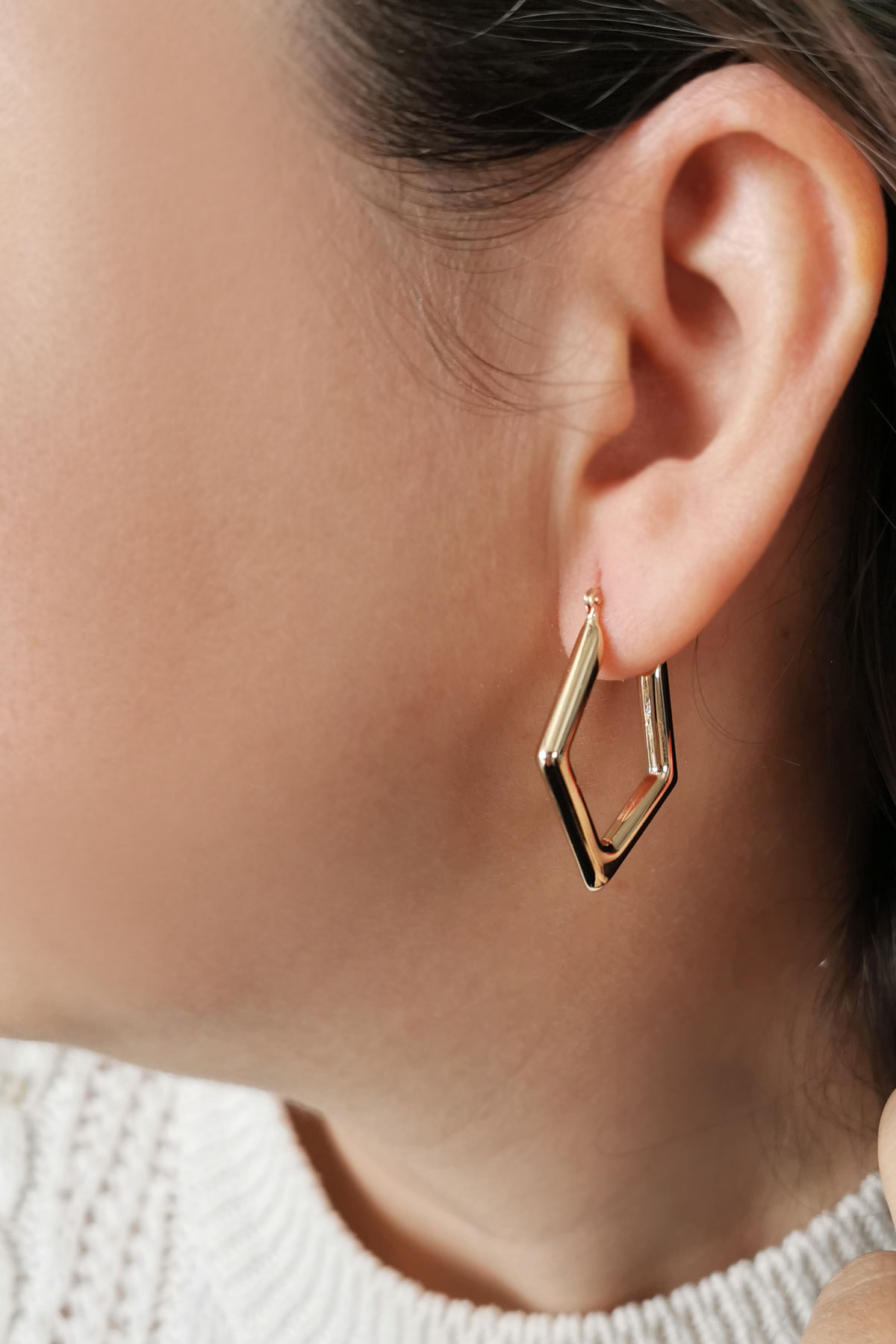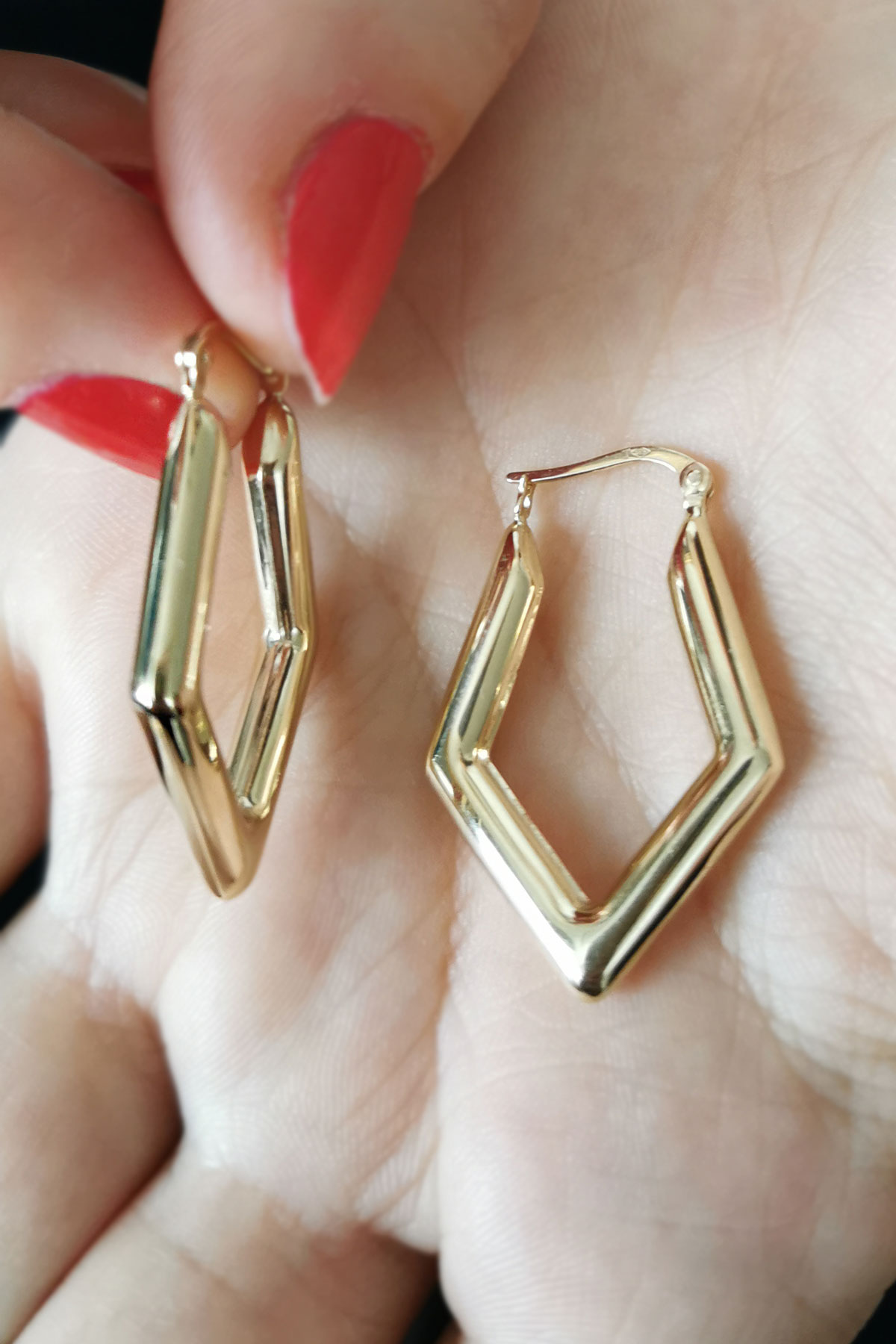 14 Ayar şık ve modern, spor tasarımı ile zarif duruşa sahip köşegen model günlük kullanıma uygun 3.25 gram ağırlığında 2.5 Cm boyunda altın halka küpe.