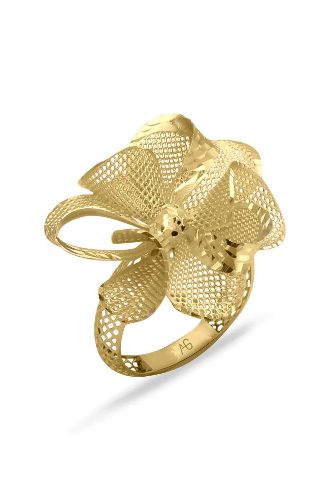 4.90 Gram Ağırlığında Dantel İşleme Elektro Füzyon Katlı Kurdela Tasarımlı Şık Bir Duruşa Sahip Gösterşli 14 Ayar Altın İtalyan Yüzük.