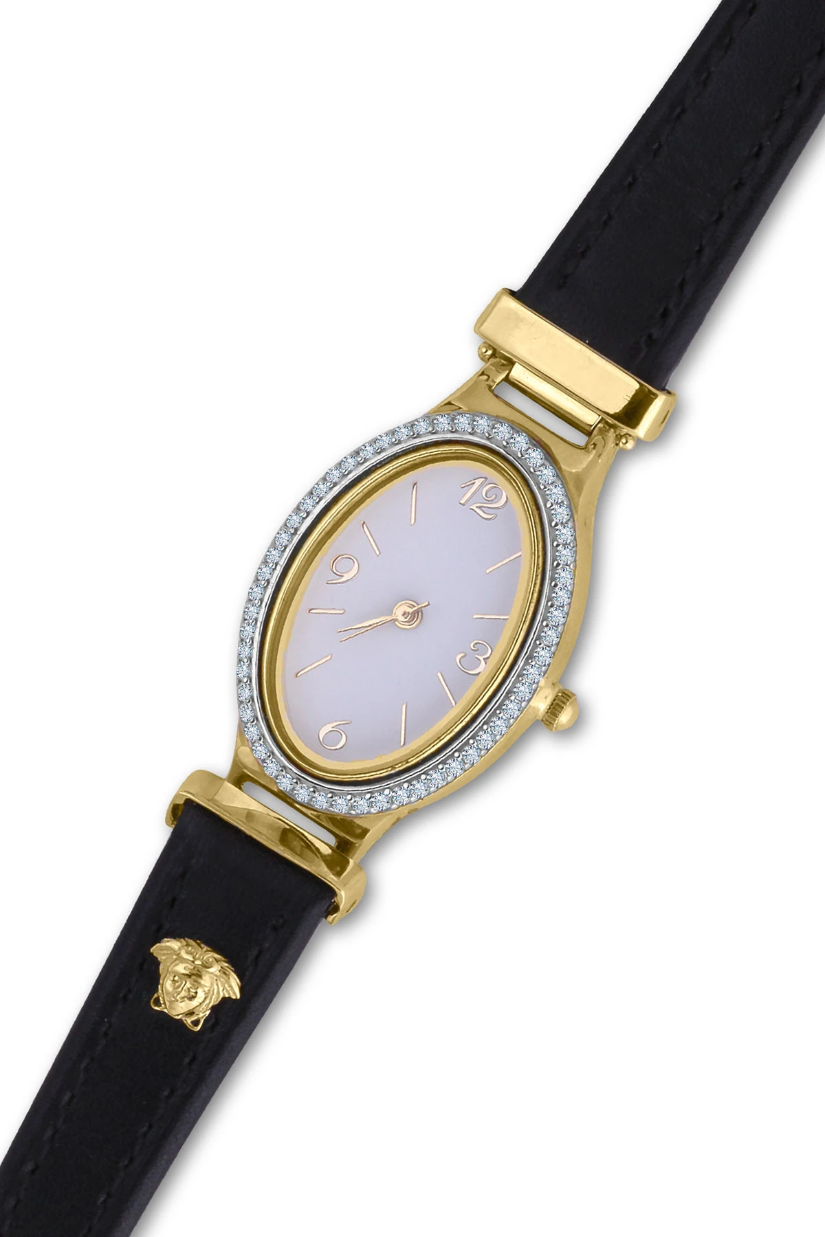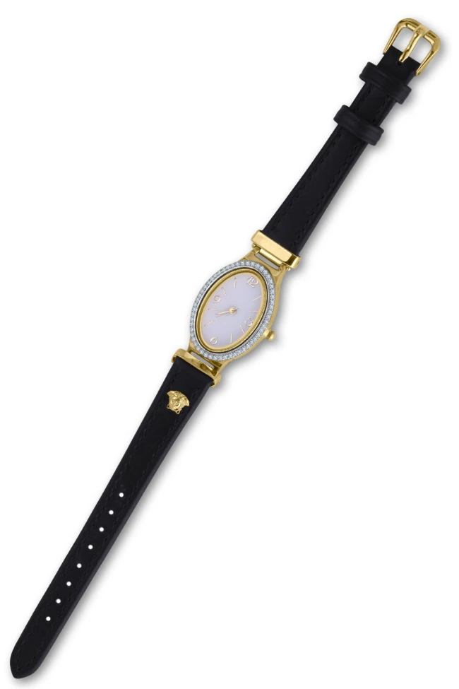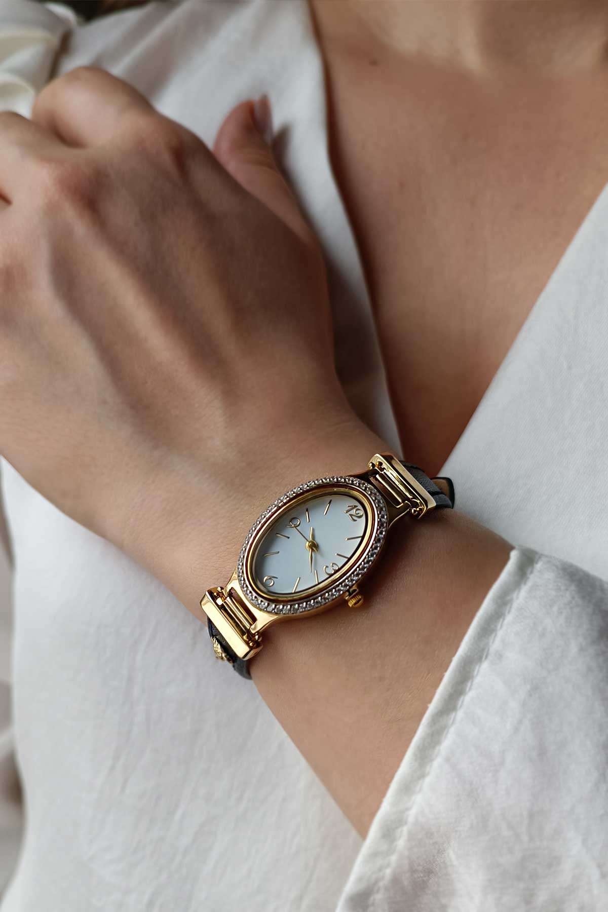 14 Ayar her zevke uygun en şık aksesuar olarak tabir edebileceğimiz oval, versage detaylı siyah kayışlı harika bir tasarıma sahip günlük kullanıma uygun 9.73 gram ağırlığında altın taşlı kadın kol saati.