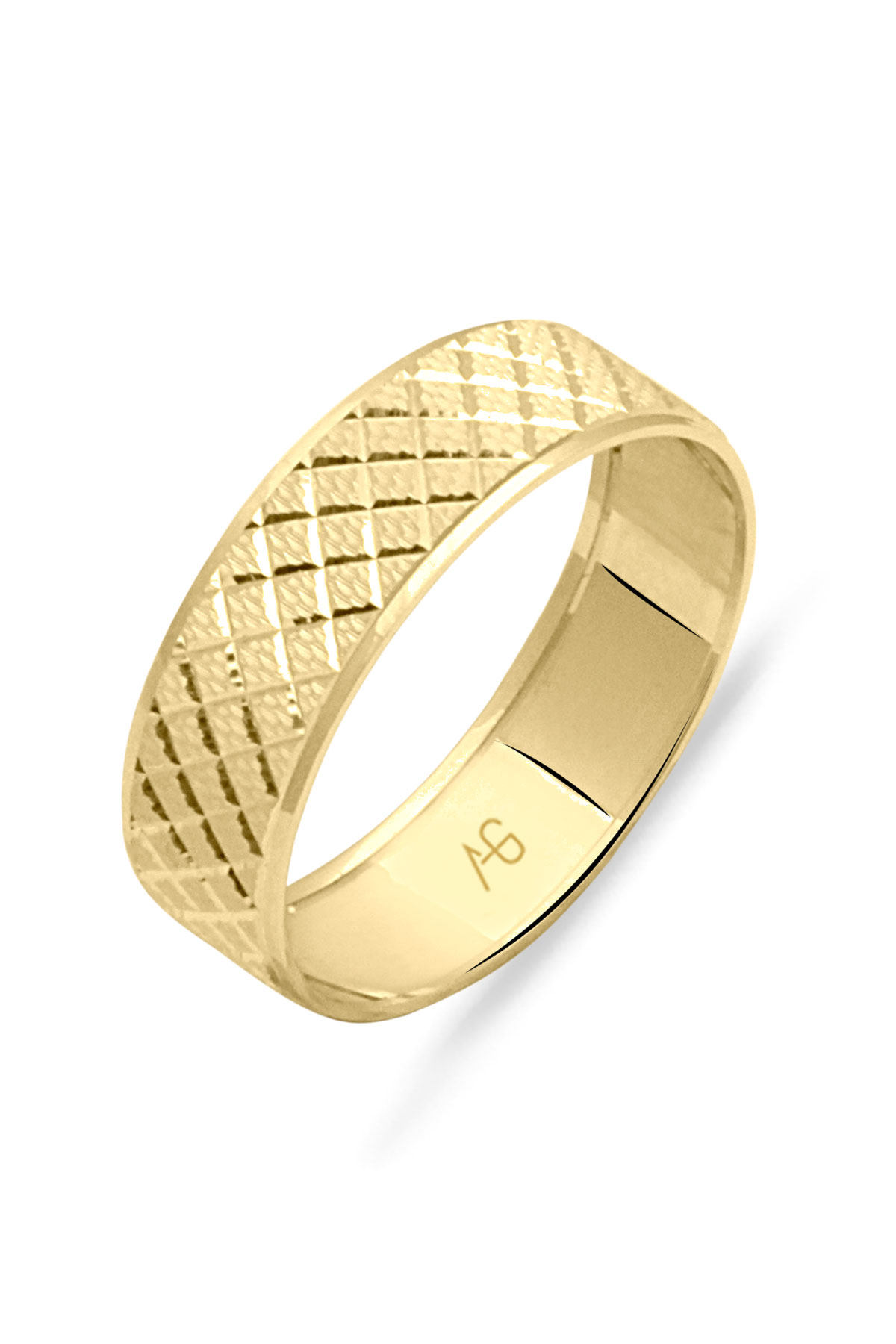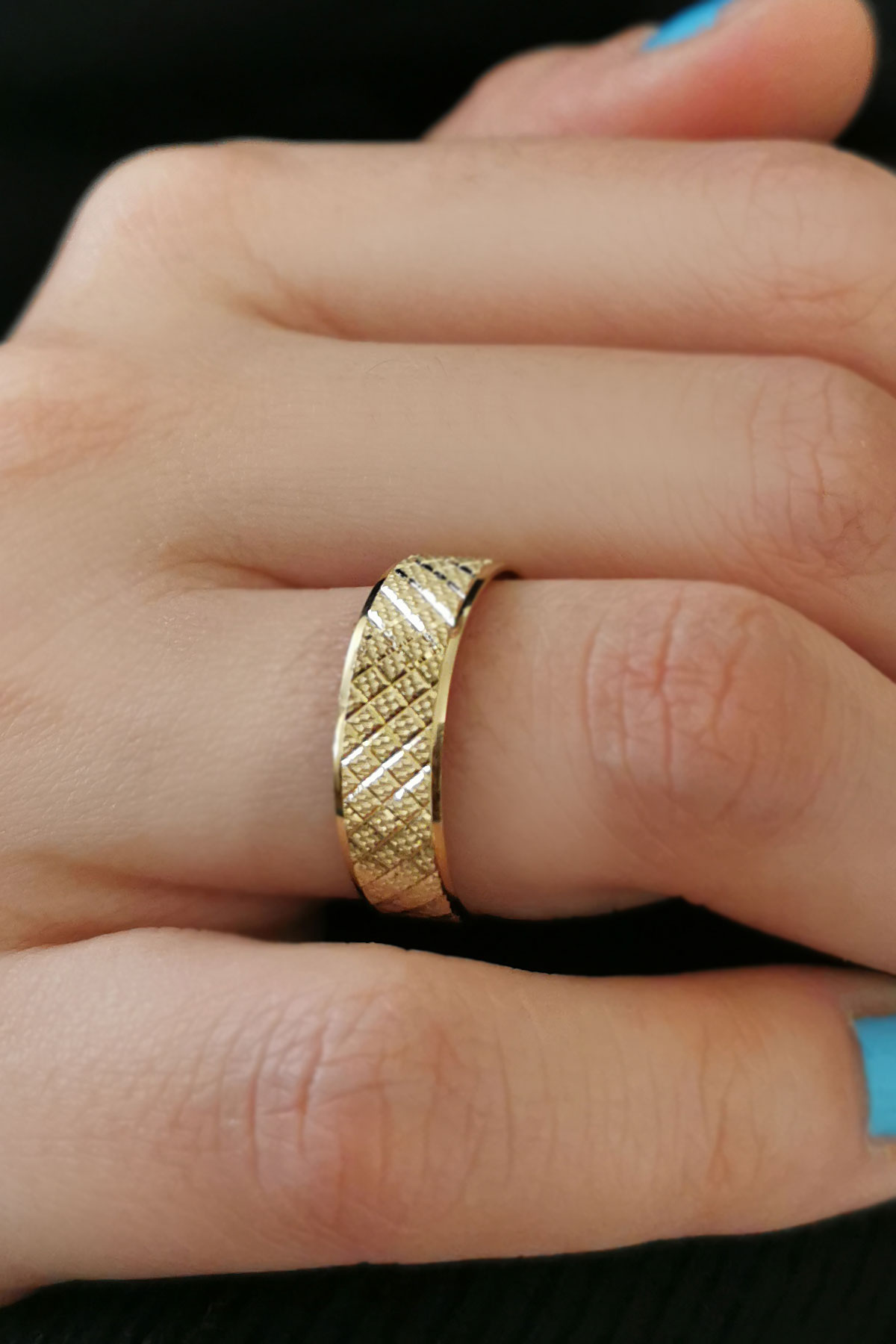 14 Ayar 1.90 gram ağırlığında petek işleme desenli şık ve günlük kullanımda sizi oldukça rahat ettirecek unisex kullanıma uygun, modern bir tasarıma sahip evlilik, nişan alyansı olarak da tercih edebileceğiniz altın taşsız alyans.