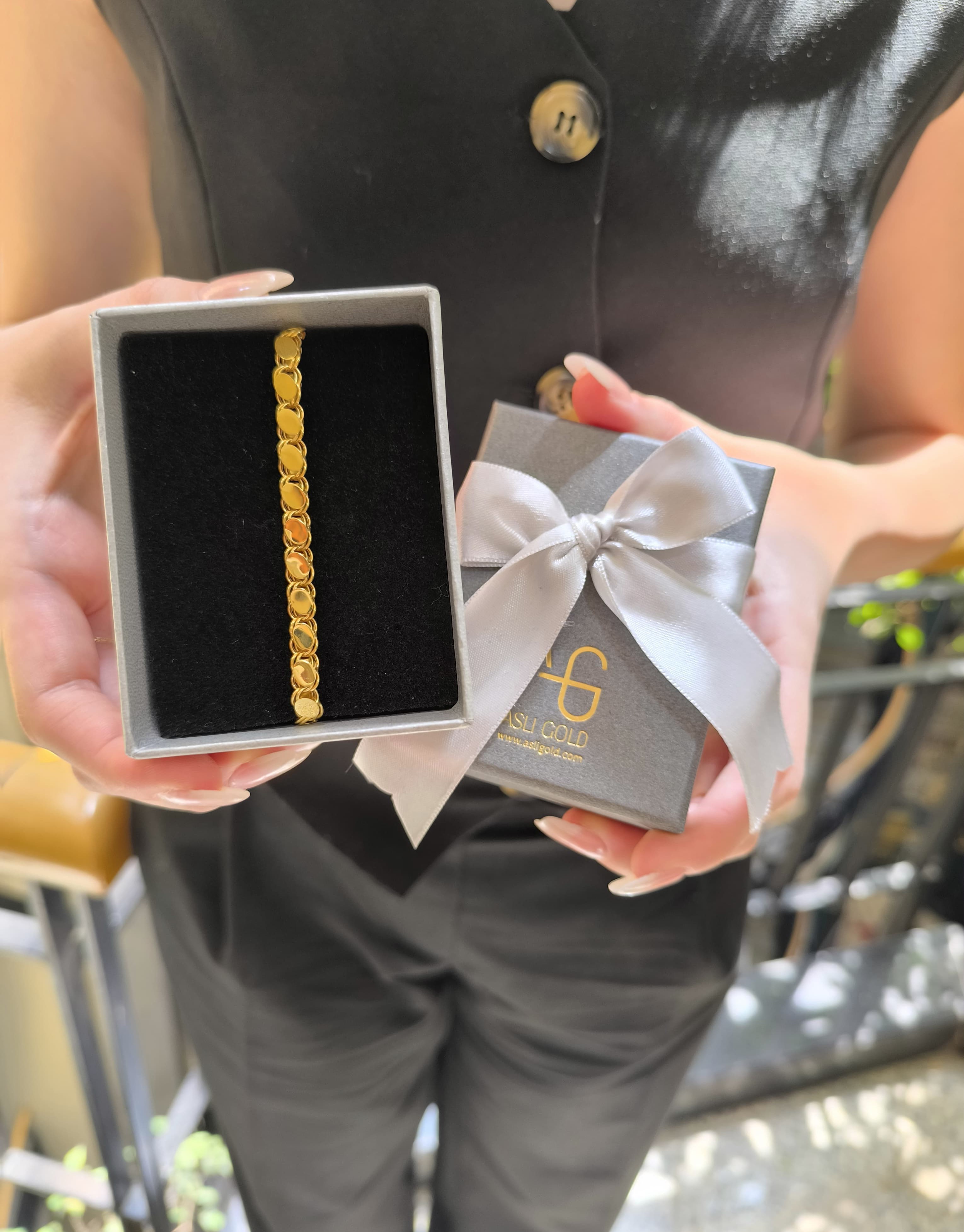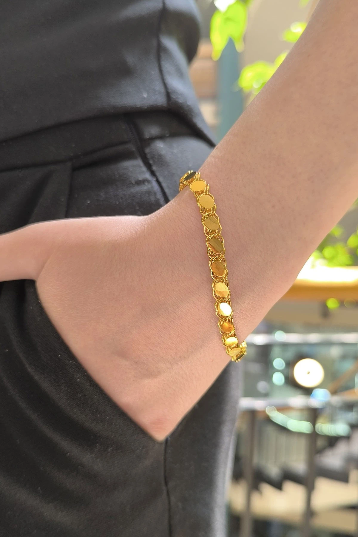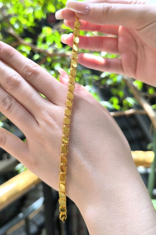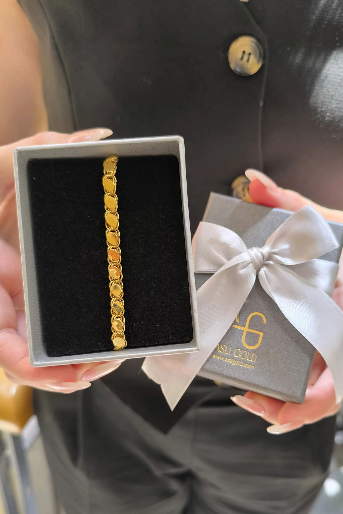 14 Ayar ışıl ışıl gösterişli ve şık duruşa sahip süzme model günlük kullanıma uygun 5.20 gram ağırlığında 19 Cm altın pullu zincir bileklik.