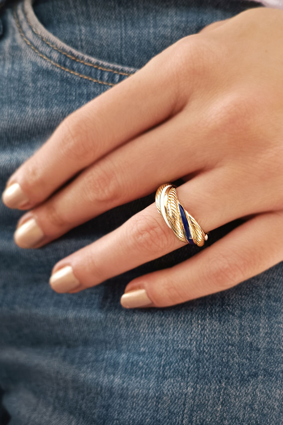 14 Ayar oldukça dolgun duruşa sahip lacivert ve beyaz mineli modeli ile günlük kullanıma oldukça uygun, sevdiklerinize yada kendinize armağan olarak tercih edebileceğiniz modern tasarım 4.90 gram ağırlığında farklı model yüzüklerinizle bir arada da kullanabileceğiniz altın taşsız sarık yüzük.