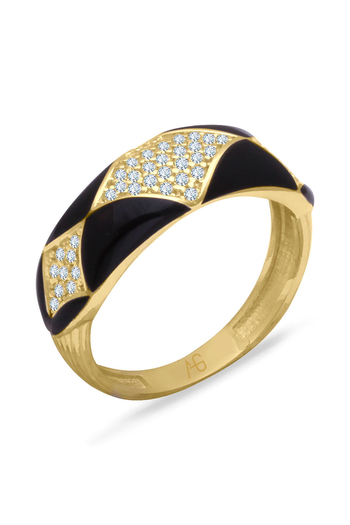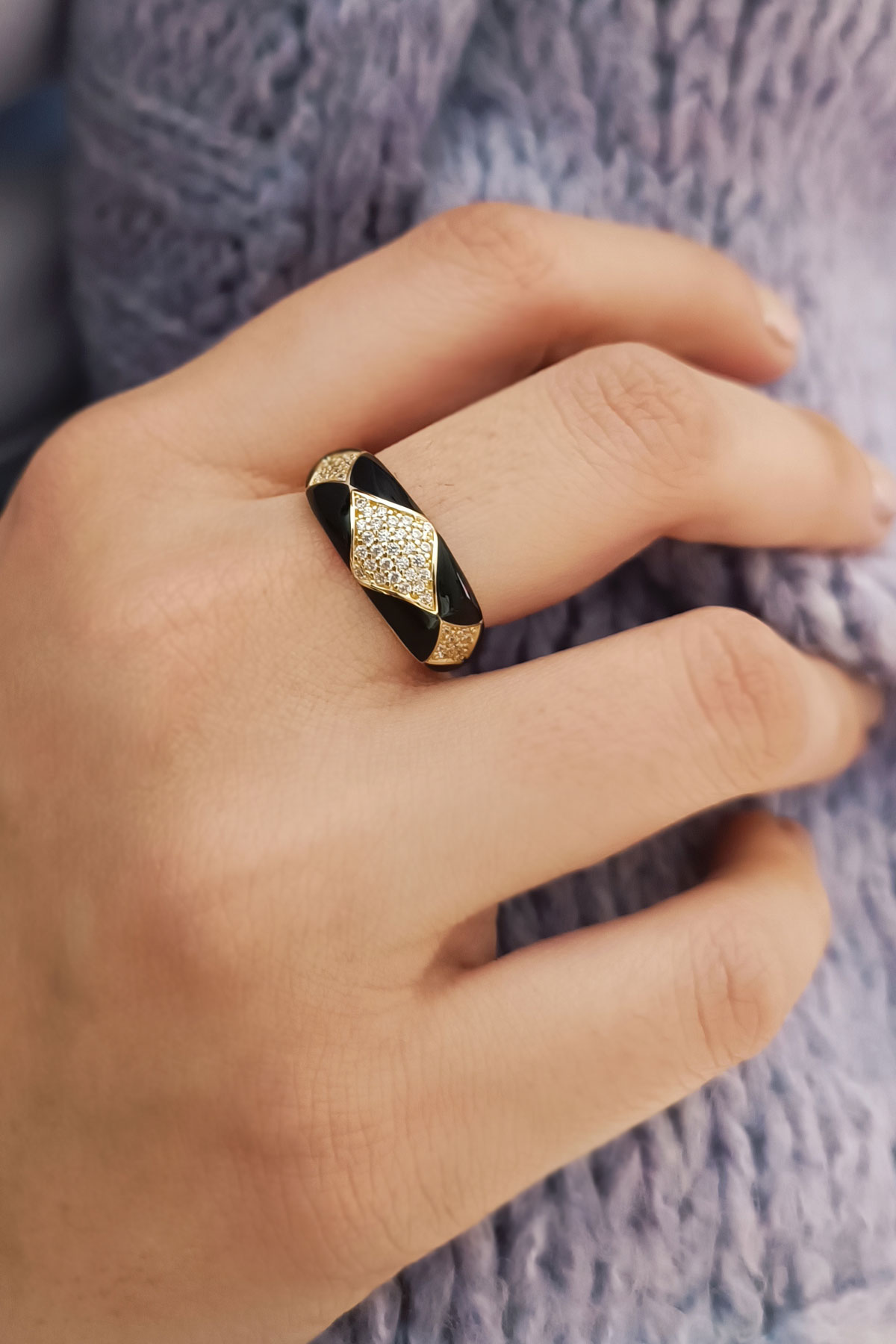 14 Ayar modern tasarımı ile farklı duruşa sahip siyah mineli bombe model, sevdiklerinize yada kendinize armağan olarak tercih edebileceğiniz modern tasarım günlük kullanıma uygun 2.80 gram ağırlığında kombin yüzük.