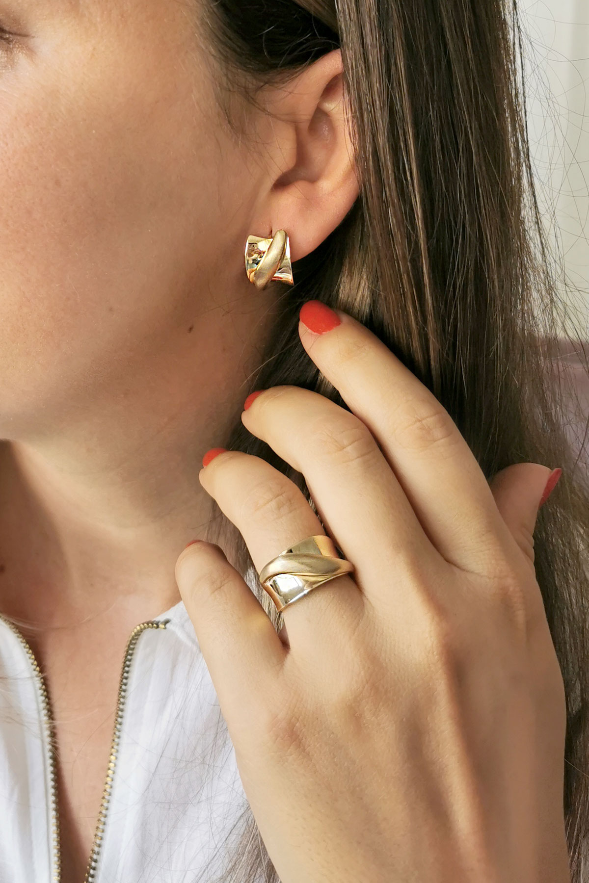 10.15 Gram Ağırlığında Taşsız Bant Geçiş Detaylı Tasarımına Eşlik Eden Mat Ve Parlak Geçişleri İle Oldukça Hoş Bir Havaya Sahip, Gösterişli Ve Günlük Kullanıma Uygun 14 Ayar Altın Dolgun Yüzük, Küpe Takım.