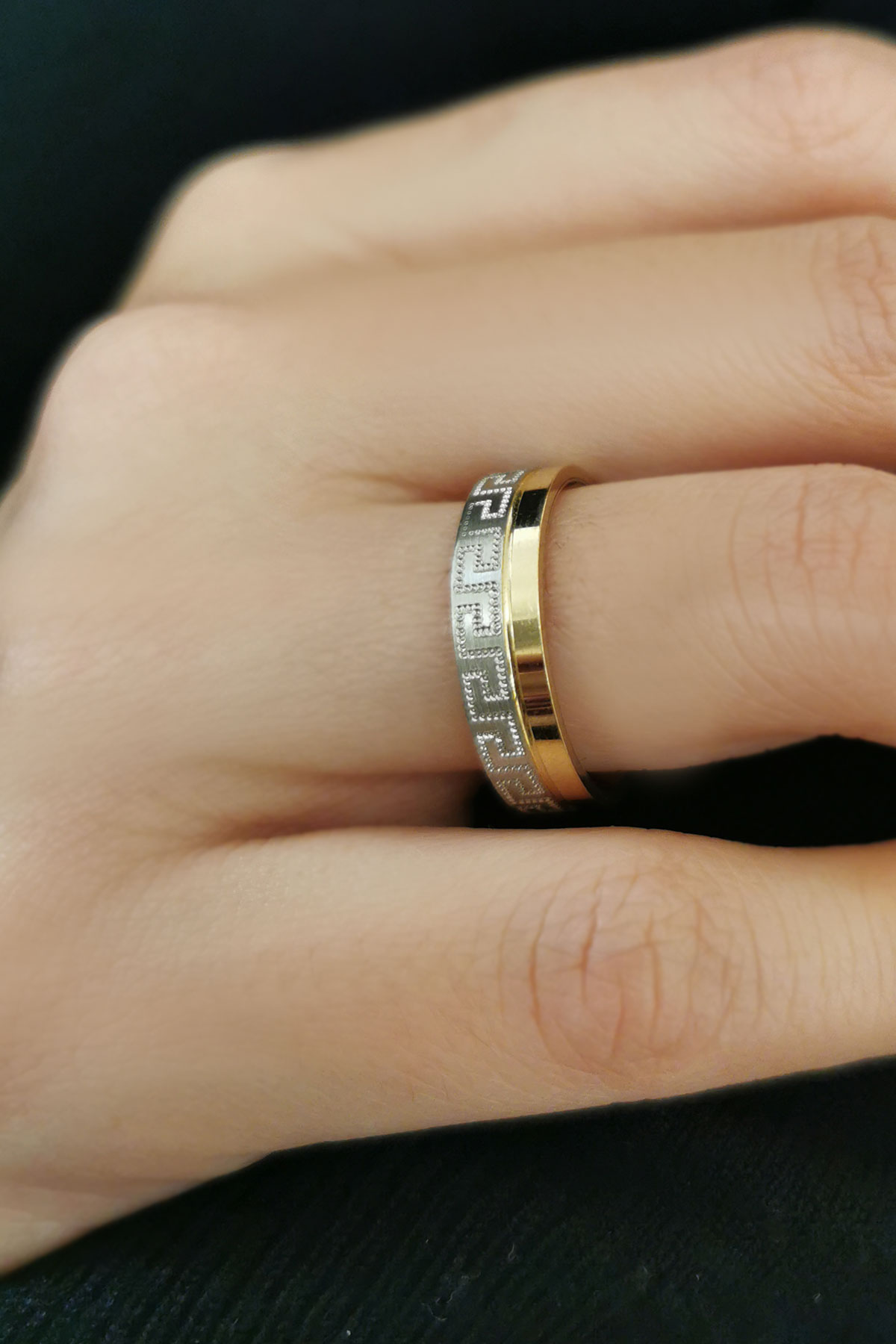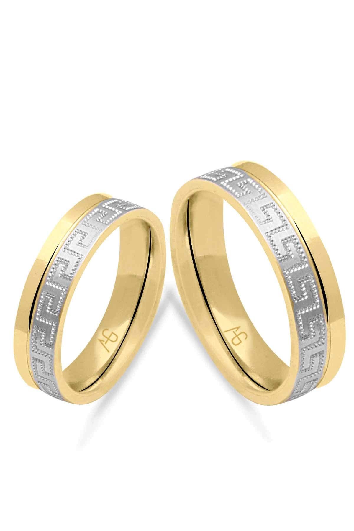 14 Ayar 7 gram ağırlığında çift renk grek desenli şık ve günlük kullanımda sizi oldukça rahat ettirecek unisex kullanıma uygun, modern bir tasarıma sahip evlilik, nişan alyansı olarak da tercih edebileceğiniz altın çift alyans.
