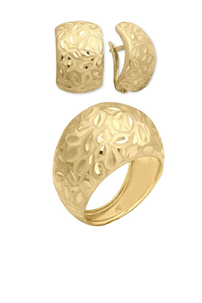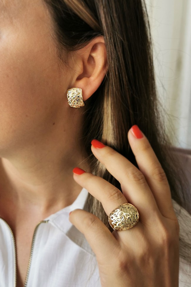 6.55 Gram Ağırlığında Taşsız Geniş Bombeli Kristal Yaprak Kalem İşleme Detaylı Oldukça Hoş Bir Havaya Sahip, Gösterişli Ve Günlük Kullanıma Uygun 14 Ayar Altın Yüzük Küpe İkili Takım.