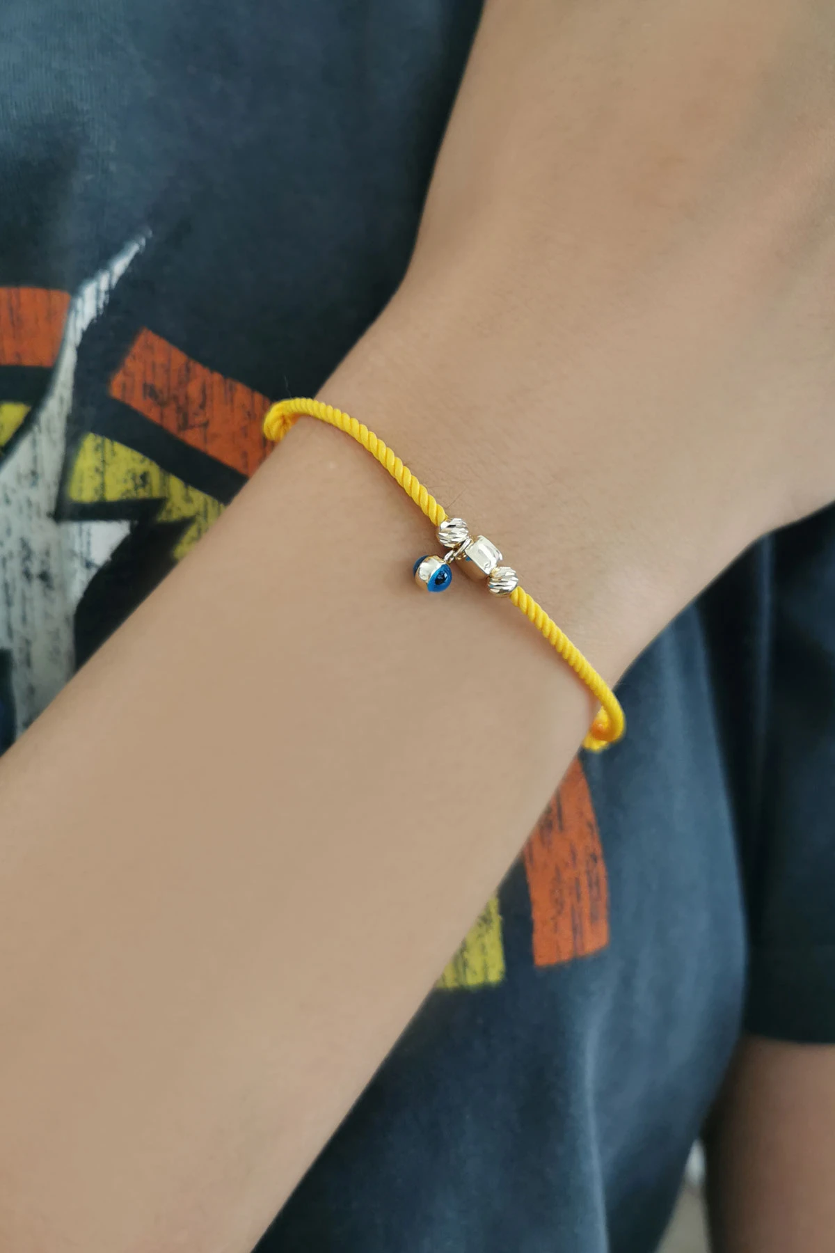 Sarı ipli tasarımı ile günlük olarak saatlerinizle yada tek olarak kullanabileceğiniz sevdiklerinize doğum günü hediyesi olarak da armağan edebileceğiniz 14 ayar 0.65 gr ağırlığında 14 ayar altın dorika ve küp detaylı nazar bileklik.
