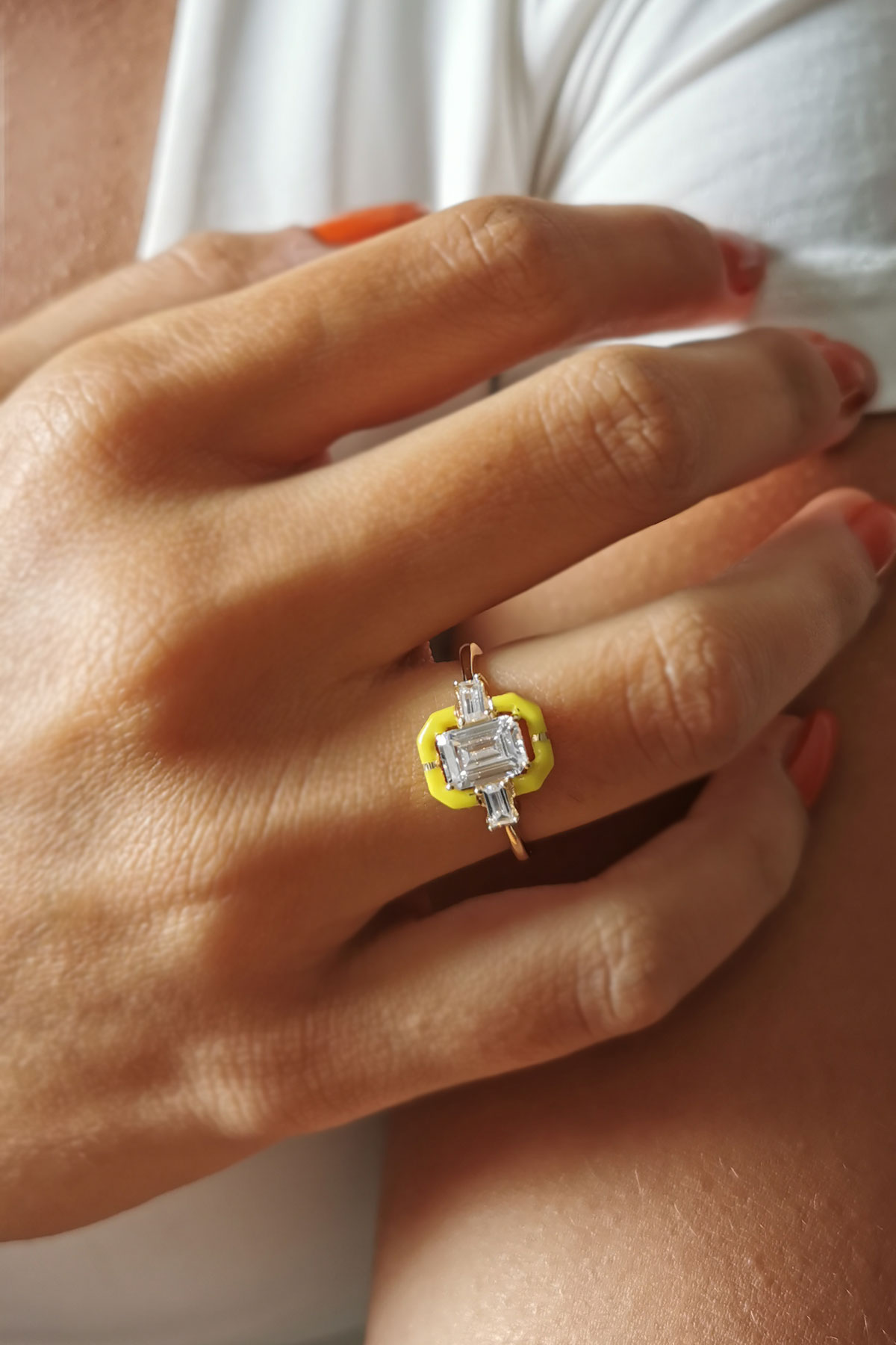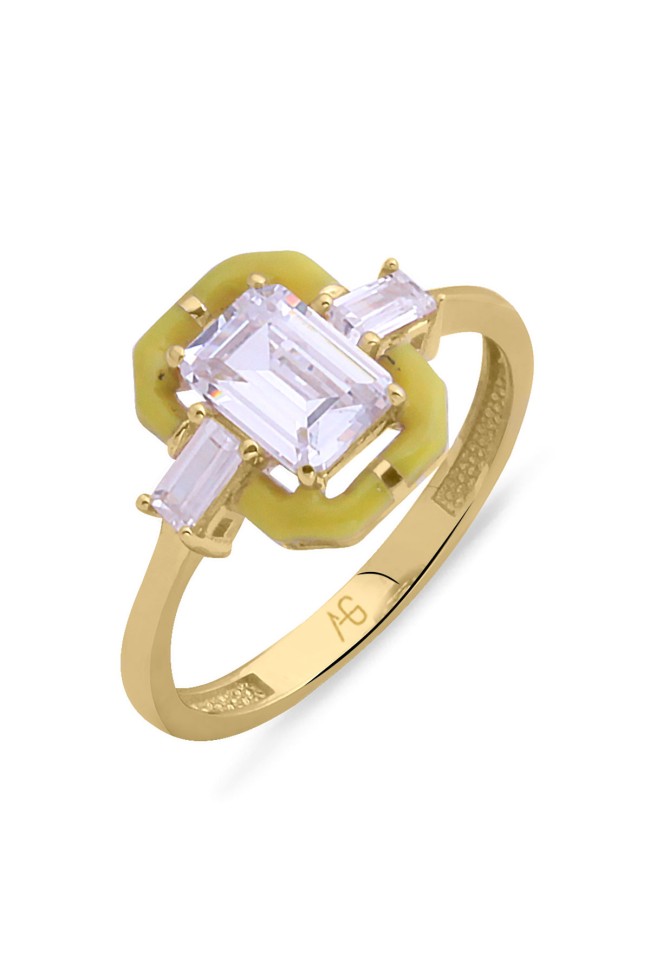 14 Ayar renkli tasarımı ile tarz duruşa sahip baget kesim taşına eşlik eden sarı mine detaylarıyla şık bir modele sahip, sevdiklerinize yada kendinize armağan olarak tercih edebileceğiniz modern model günlük kullanıma uygun 2.65 gram ağırlığında altın yüzük.