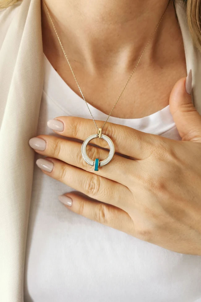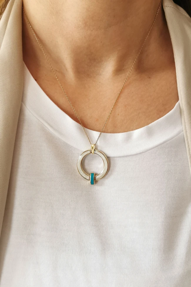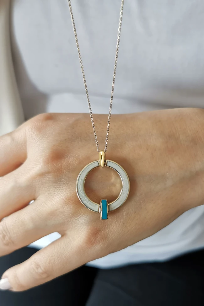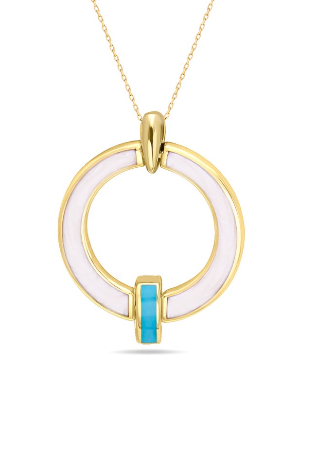 6.30 gr. 3 cm boyutunda şık ve modern bir tasarıma sahip sedefli beyaz ve turkuaz mineli altın kolye.