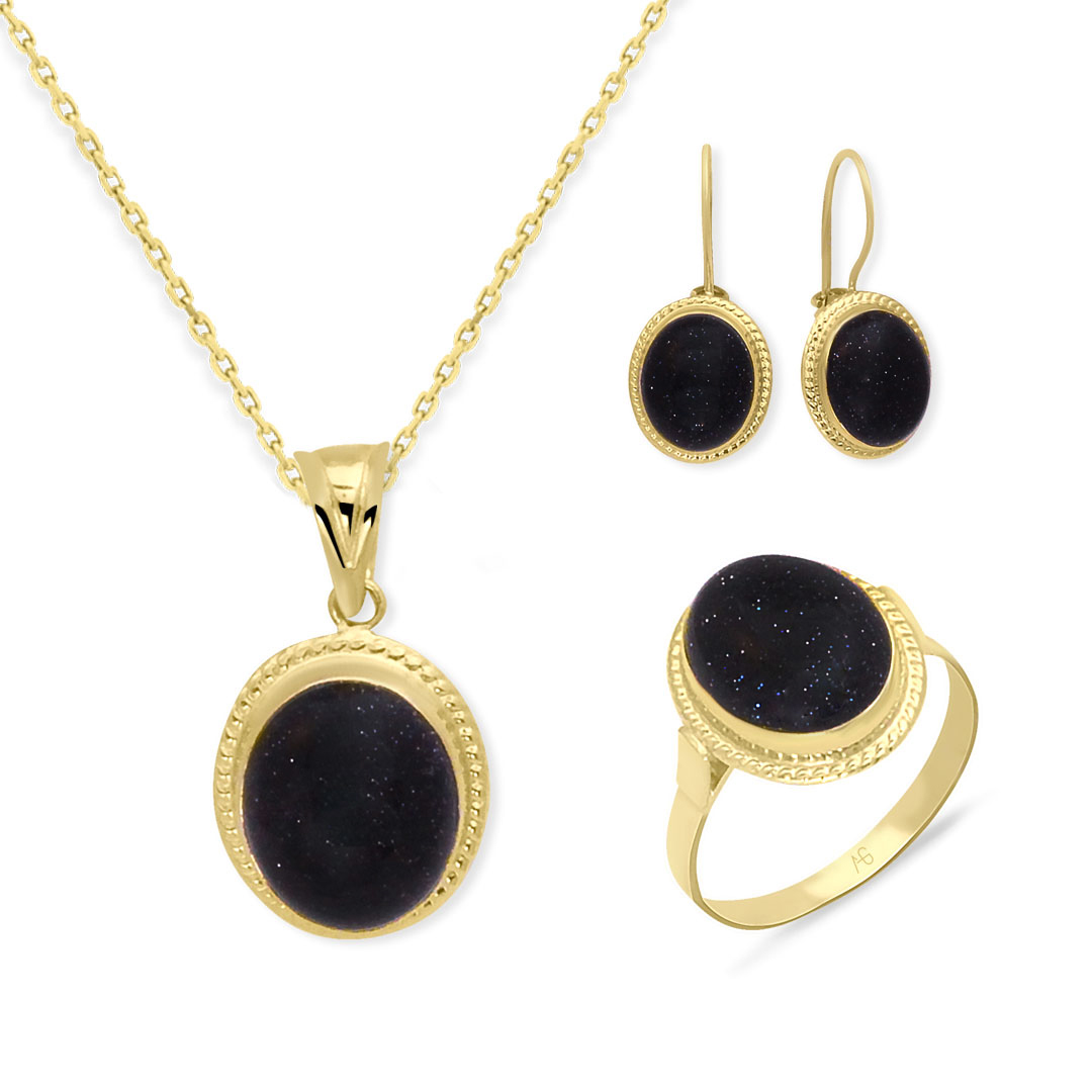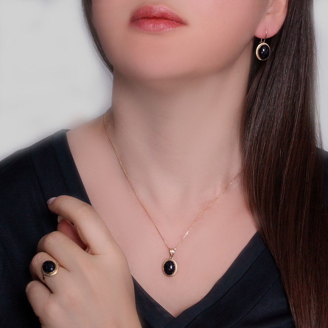 14 Ayar nostalji tasarımına eşlik eden simli siyah onyx taş detaylı şık ve ışıltılı tasarımlara düşkün kadınların severek kullanacakları elegan duruşa sahip günlük kullanıma uygun 8.25 gram ağırlığında yüzük, kolye ve küpeden oluşan üçlü altın takım.