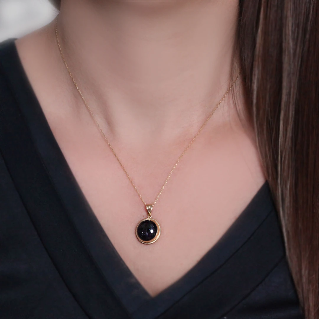 14 Ayar nostalji tasarımına eşlik eden yuvarlak simli siyah taş detaylı şık ve ışıltılı tasarımlara düşkün kadınların severek kullanacakları elegan duruşa sahip günlük kullanıma uygun 3,80 gram ağırlığında altın kolye.