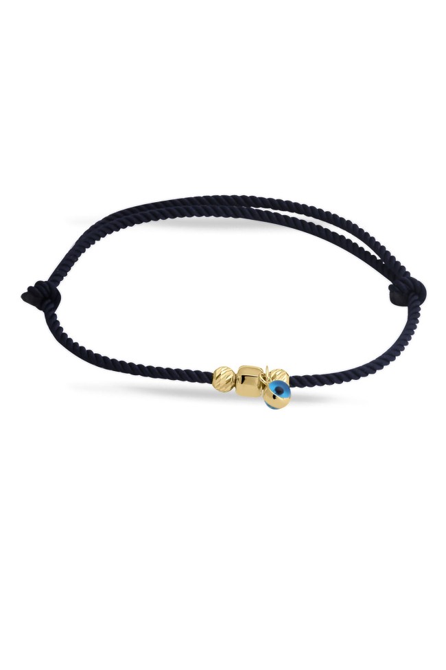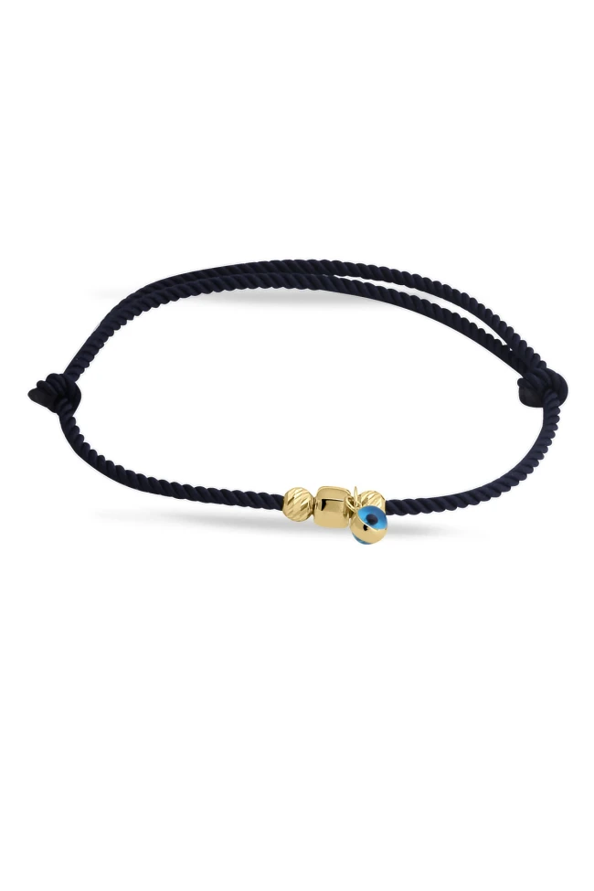 Siyah ipli tasarımı ile günlük olarak saatlerinizle yada tek olarak kullanabileceğiniz sevdiklerinize doğum günü hediyesi olarak da armağan edebileceğiniz 14 ayar 0.65 gr ağırlığında 14 ayar altın dorika ve küp detaylı nazar bileklik.